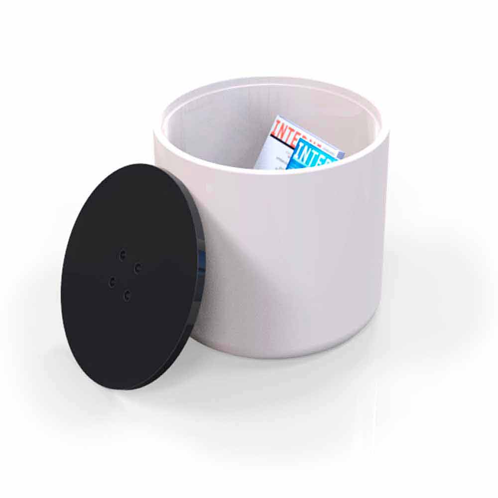 Button é uma excelente solução de economia de espaço, pois possui um prático compartimento interno acessível removendo a tampa em forma de botão.