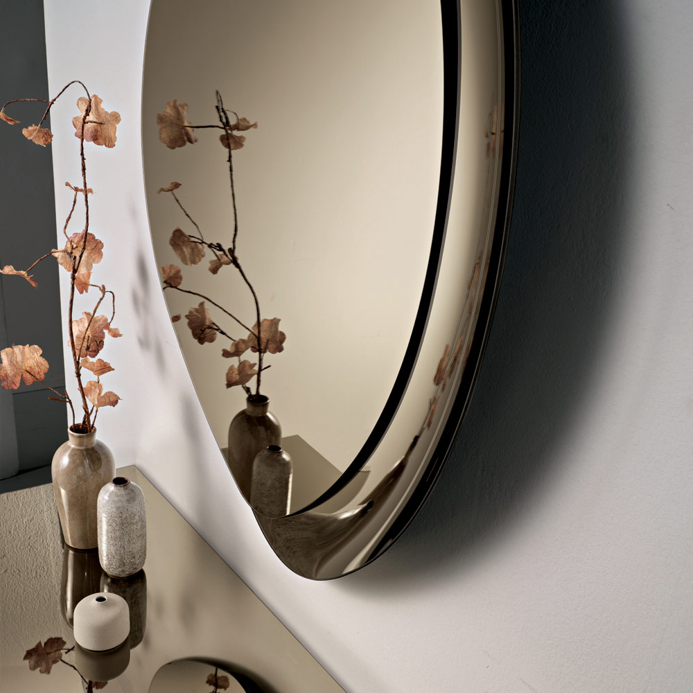 O design apresenta uma moldura semitransparente distinta em vidro fundido tom sobre tom que emoldura parcialmente a superfície refletora. Esse detalhe adiciona textura e luminosidade , criando um jogo de reflexos cativante que confere profundidade e personalidade ao espelho.