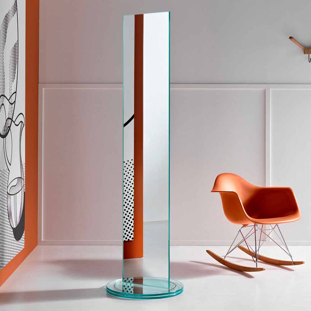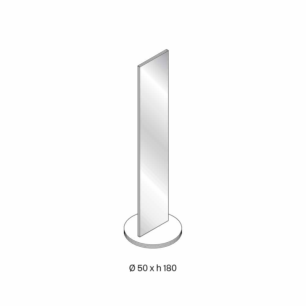 Este espelho autônomo é caracterizado pelo seu desenho escultural inteiramente feito de espelho dupla face com base giratória em vidro temperado.