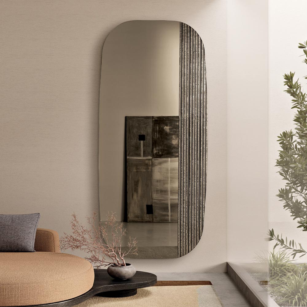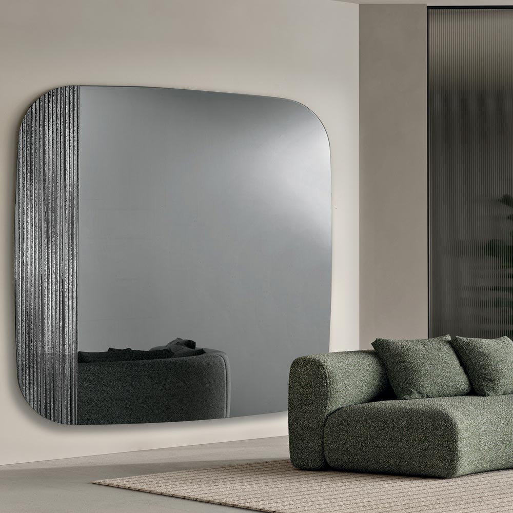 A superfície refletora apresenta um formato contornado com cantos suavemente arredondados , projetado para criar um efeito visual delicado e harmonioso. O design é embelezado com um inserto de vidro canelado prateado tom sobre tom na parte traseira, que adiciona profundidade e movimento, criando uma interação refinada de luz e textura na superfície do espelho.
