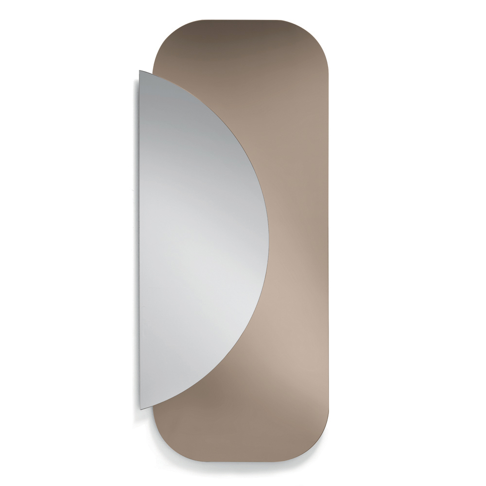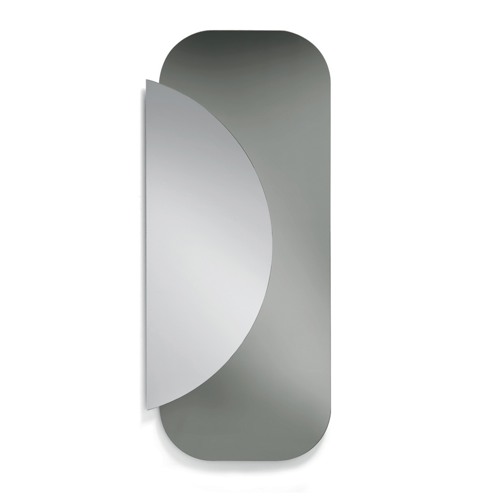 A composição é formada por duas placas sobrepostas : uma base retangular com cantos arredondados e um semicírculo de espelho natural que se sobrepõe, criando um diálogo elegante entre geometria e reflexos. Esse contraste entre formas e materiais gera um efeito visual dinâmico e contemporâneo.