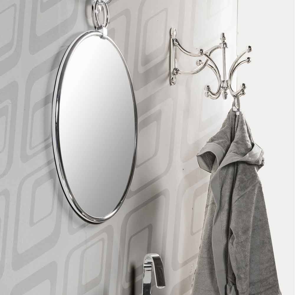 Espelho em latão cromado que pode ser pendurado com argola e gancho fornecido. O espelho é padrão de um lado e envelhecido com efeito oxidado do outro.