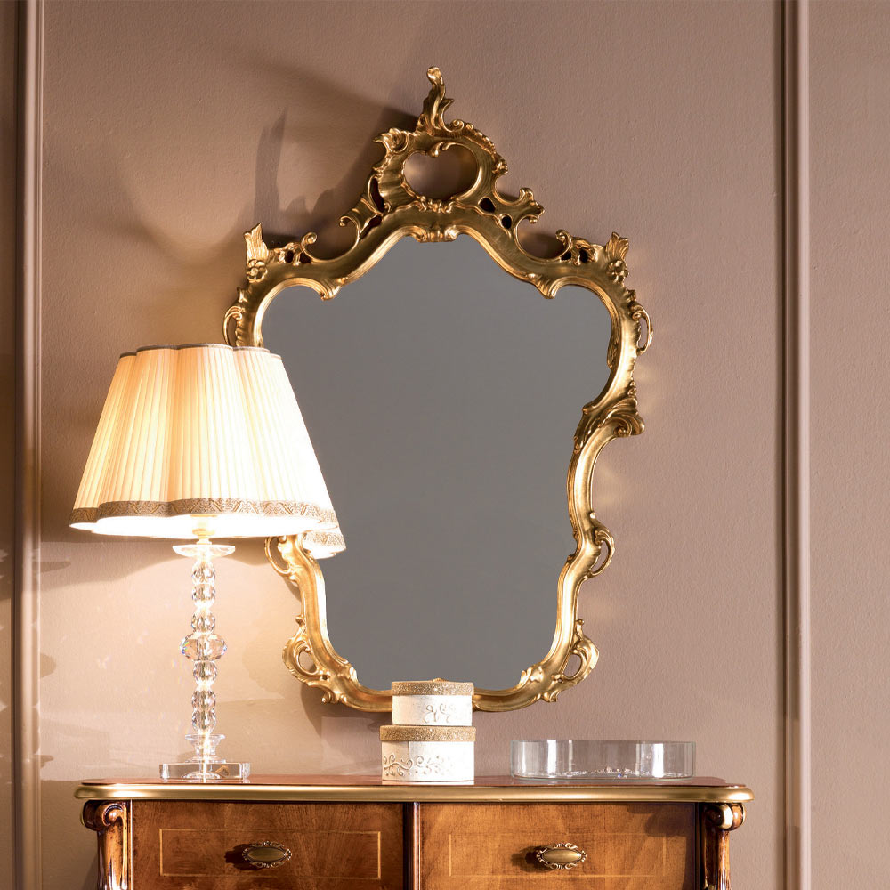 Espelho estilo clássico com moldura moldada com acabamento em folha de ouro , ideal para decorar qualquer ambiente com personalidade e originalidade. Um complemento único e refinado, totalmente feito na Itália por mestres artesãos , mestres da arte que finalizam cada complemento com sabedoria e gosto pela elegância. A produção é realizada com materiais nobres , realizando o trabalho à mão com o máximo cuidado e profissionalismo que distingue os produtos Made in Italy .