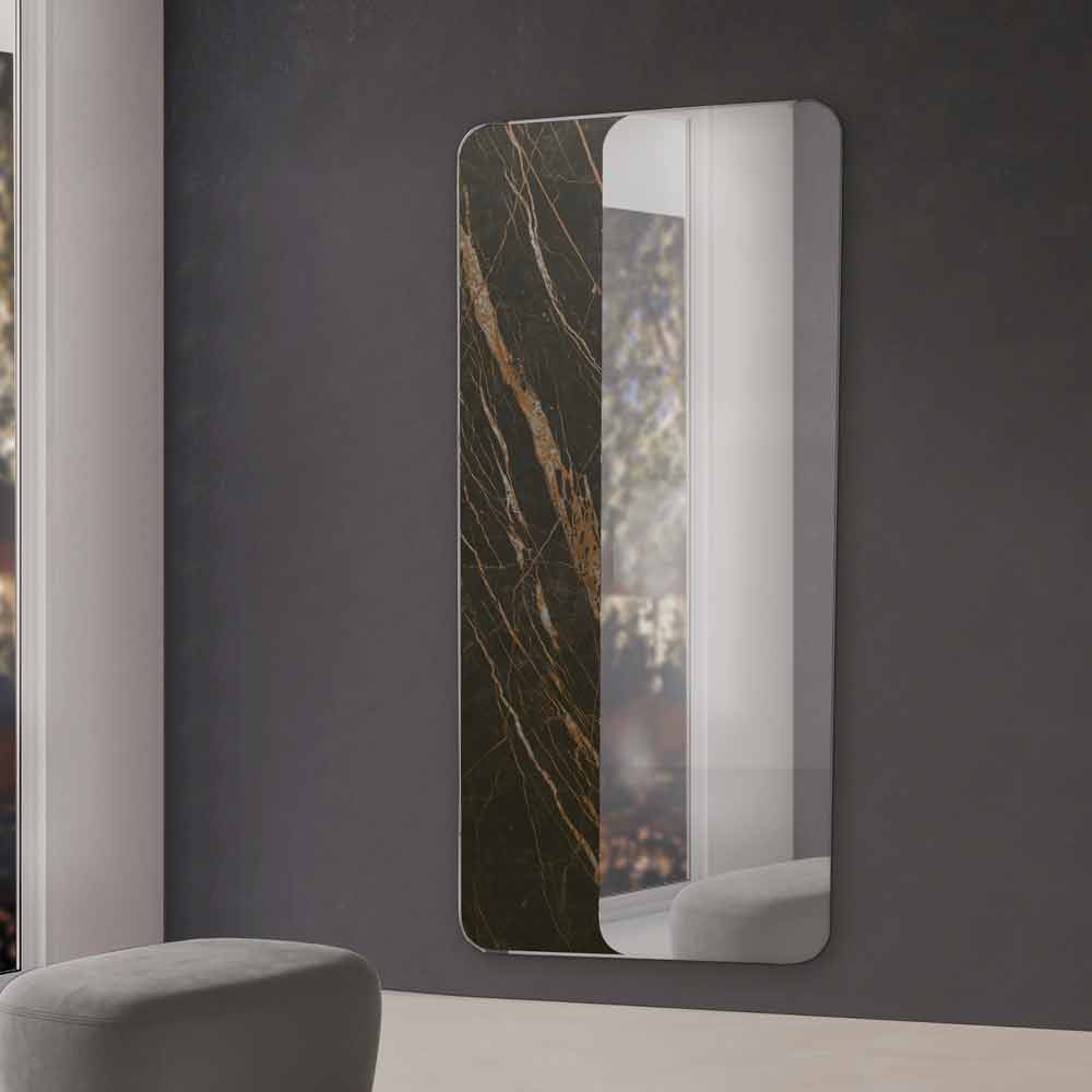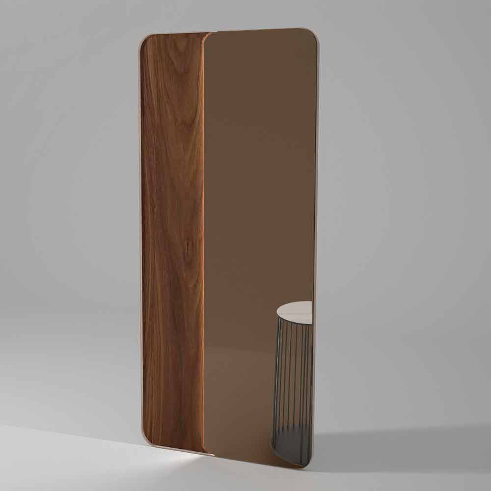 Espelho de parede inteiramente fabricado na Itália, composto por um anel externo em metal e uma inserção lateral em cerâmica ou madeira completada por um espelho revestido em bronze ou prata. Um