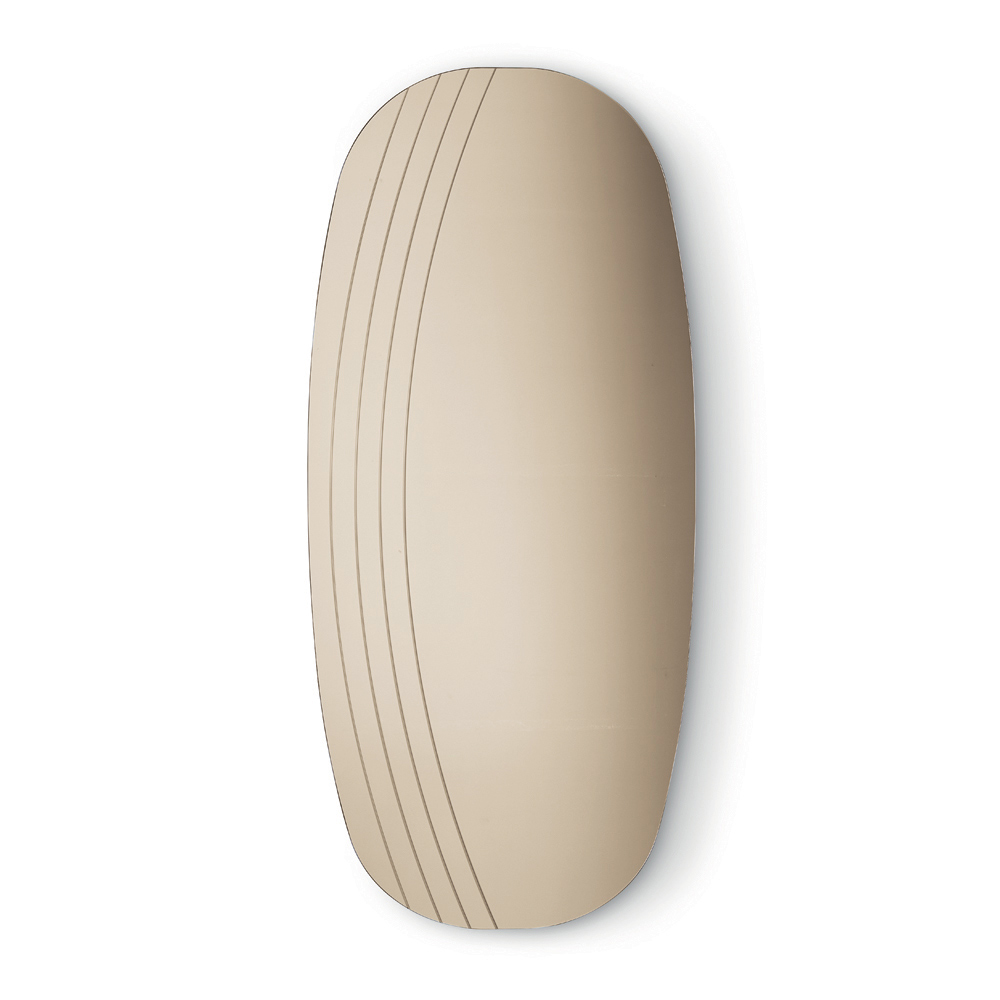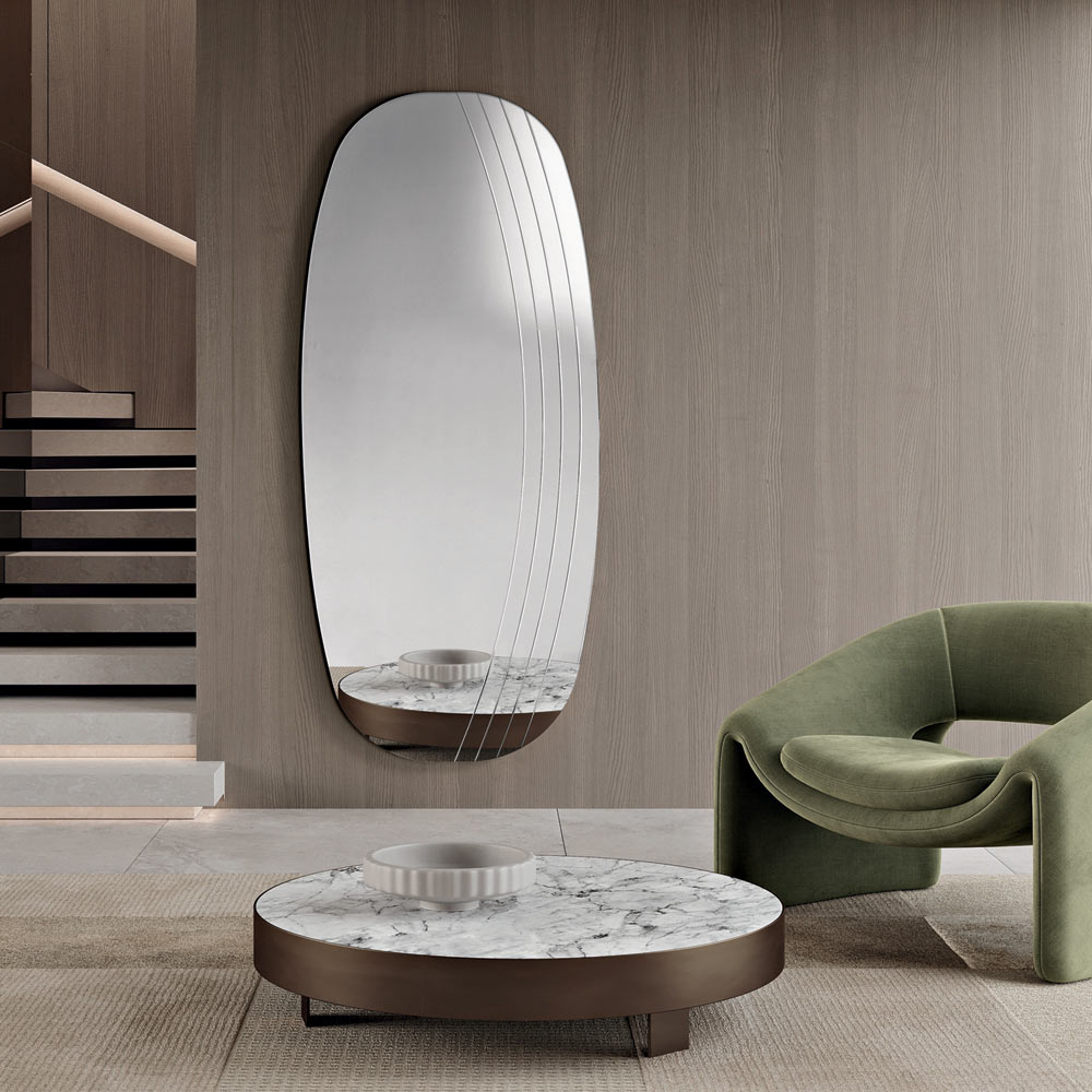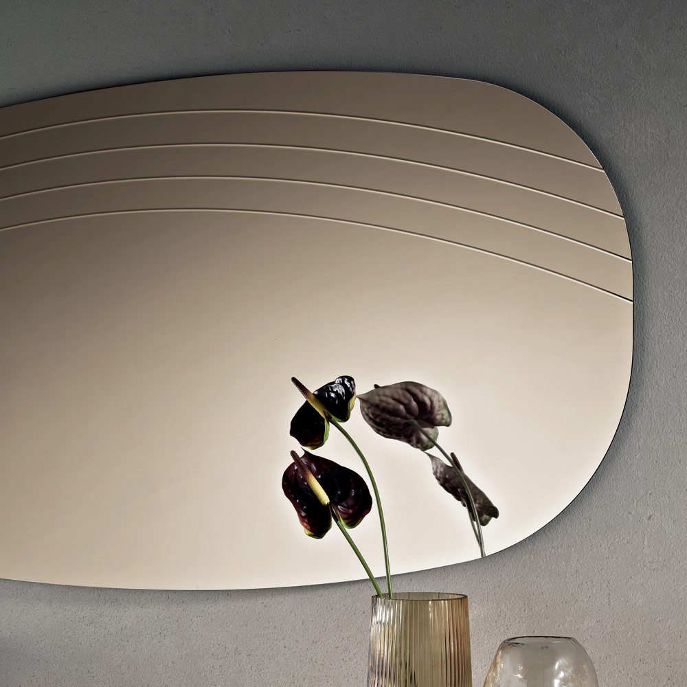 A superfície refletora é realçada por delicadas incisões laterais que acompanham o perfil sinuoso do espelho, criando uma interação refinada de luz e textura. Esse detalhe decorativo adiciona profundidade visual e enfatiza a harmonia das formas, conferindo ao espelho um toque sofisticado e moderno.