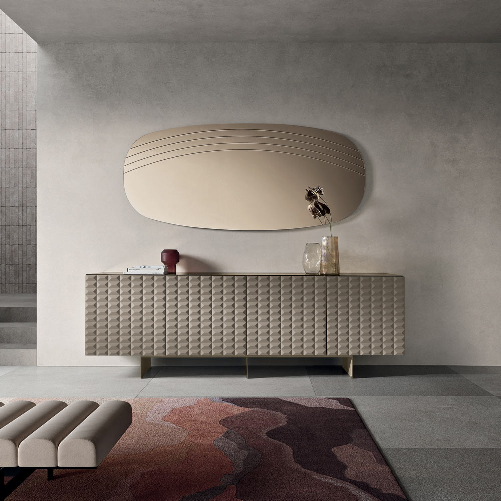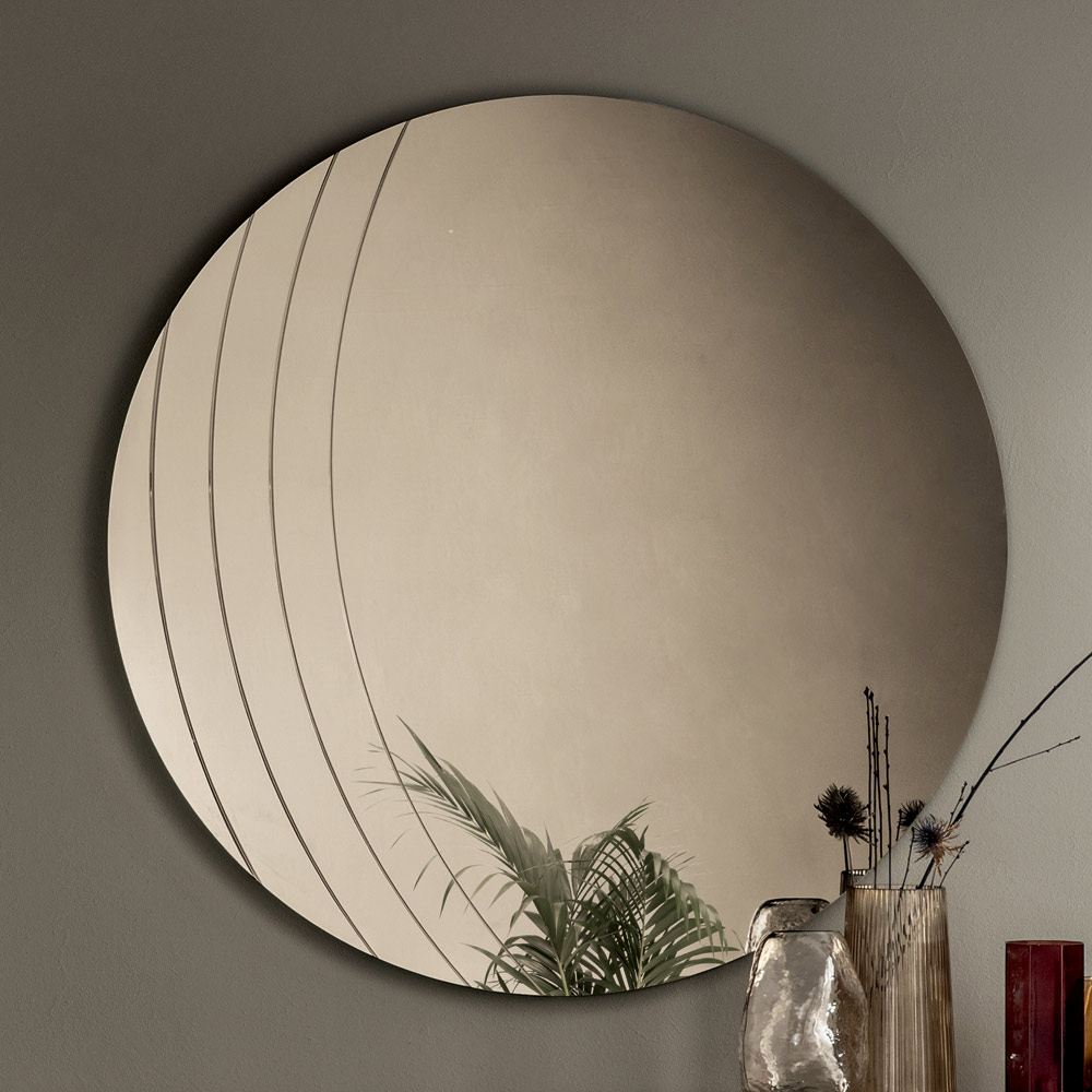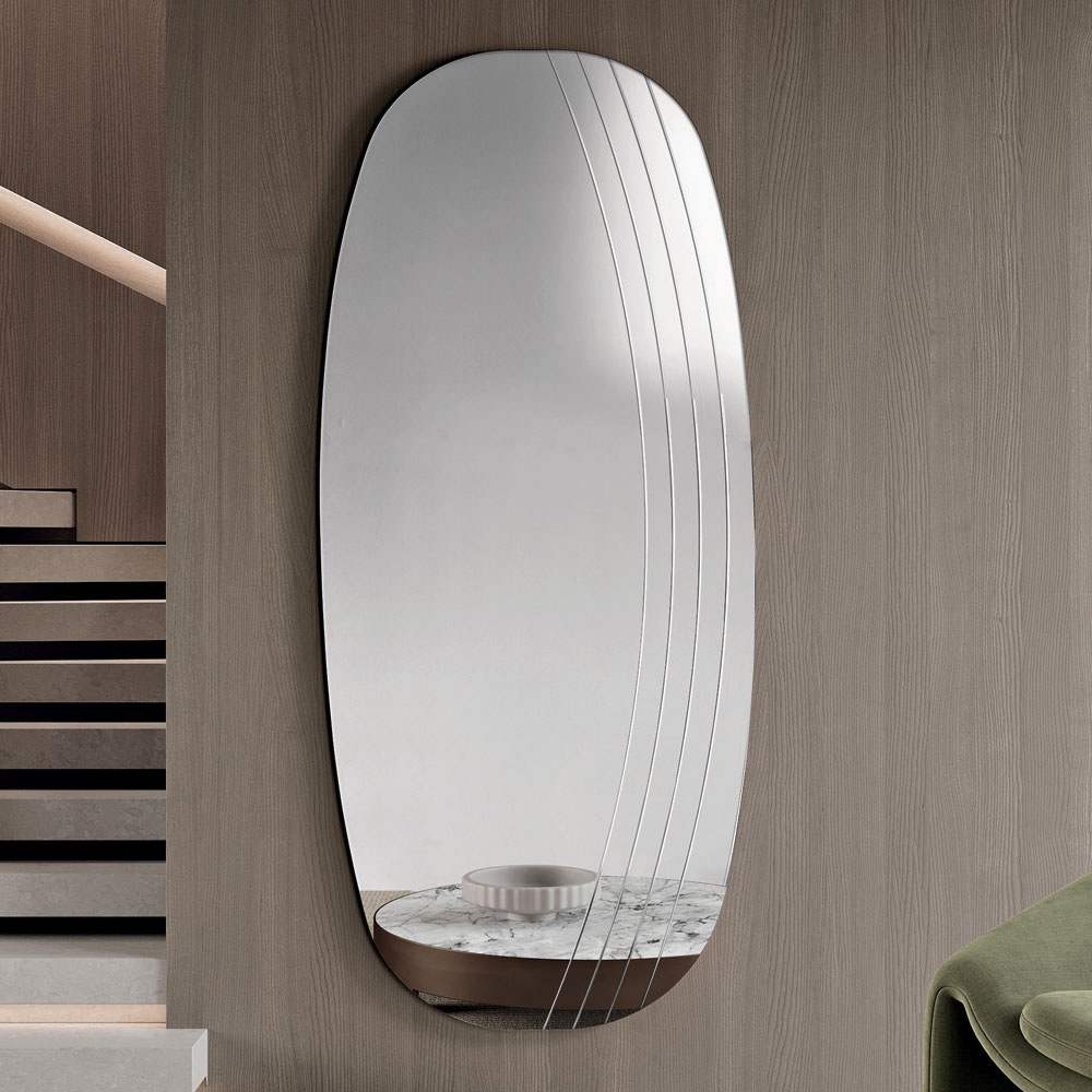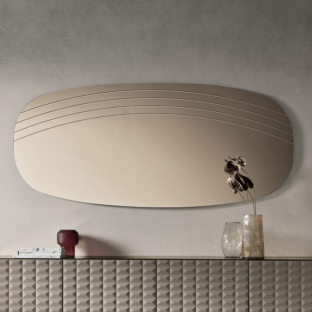 A superfície refletora é realçada por delicadas incisões laterais que acompanham o perfil sinuoso do espelho, criando uma interação refinada de luz e textura. Esse detalhe decorativo adiciona profundidade visual e enfatiza a harmonia das formas, conferindo ao espelho um toque sofisticado e moderno.