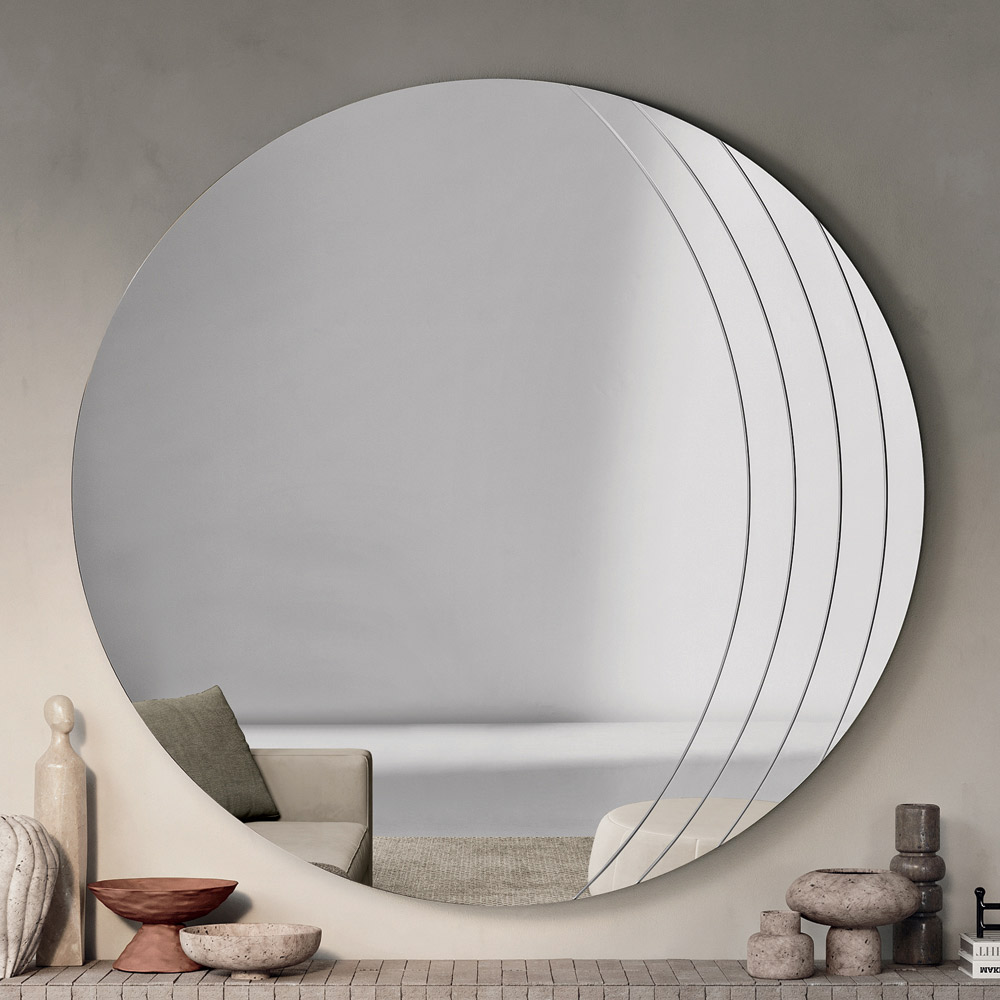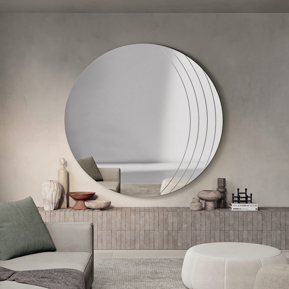 Disponível em vários tamanhos e formatos — duas versões circulares e uma retangular com cantos arredondados — o espelho adapta-se facilmente a diversos contextos de decoração, tornando-se um complemento elegante para espaços contemporâneos e sofisticados.