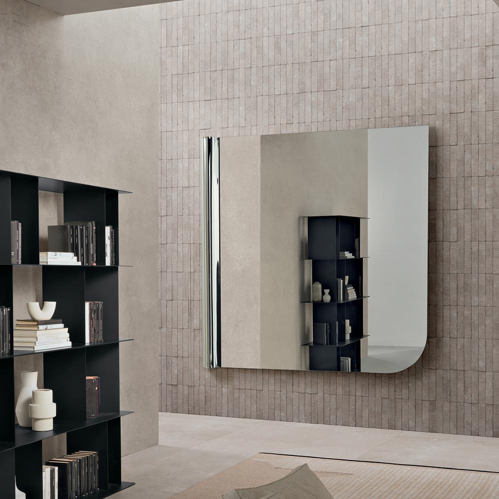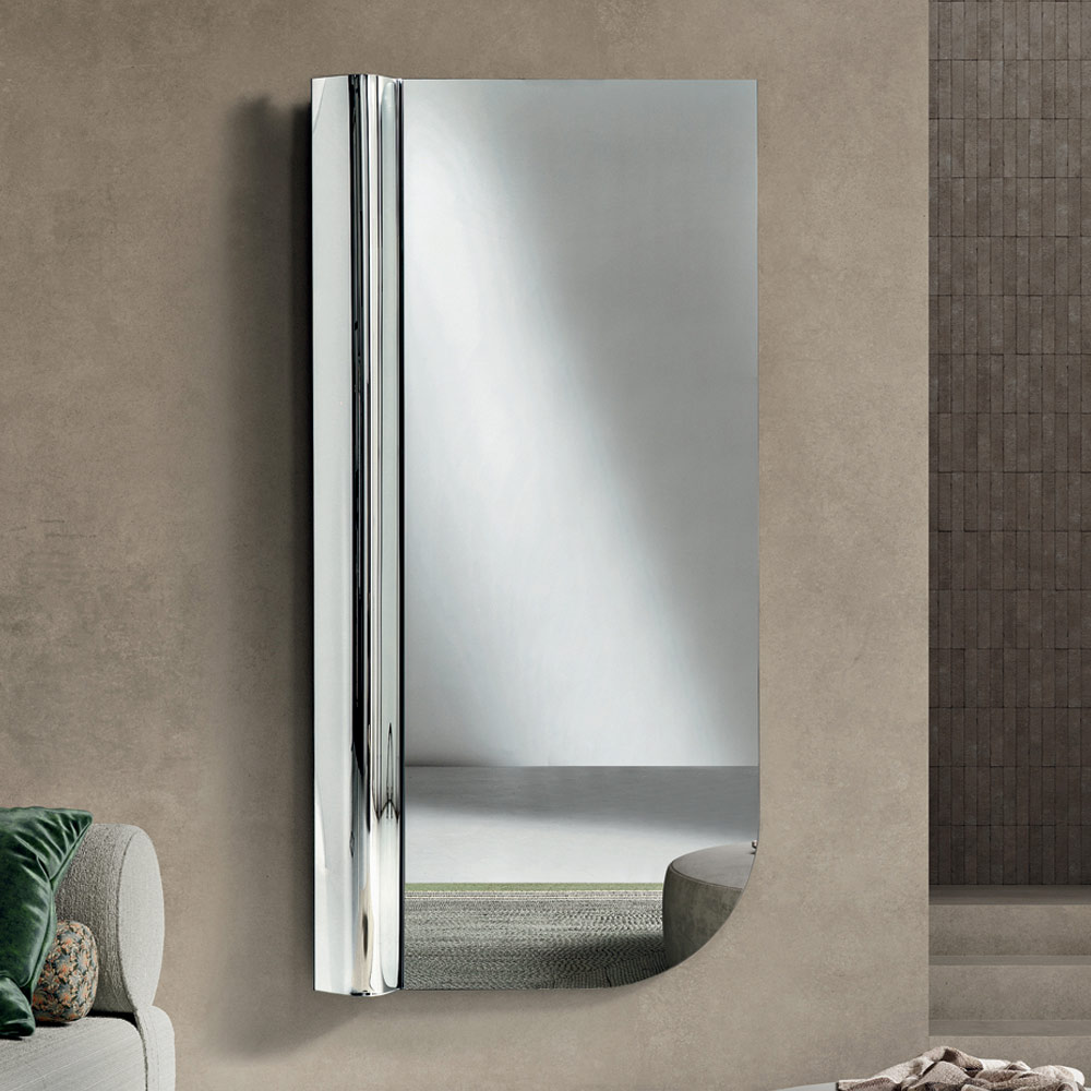 O equilíbrio entre a suave assimetria e as linhas essenciais faz deste espelho um acessório de decoração sofisticado, capaz de enriquecer a parede com um toque gráfico moderno e ampliar a luminosidade do ambiente.