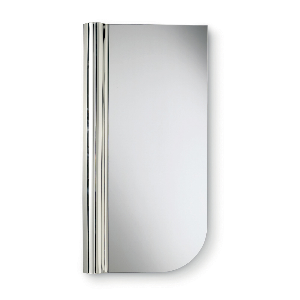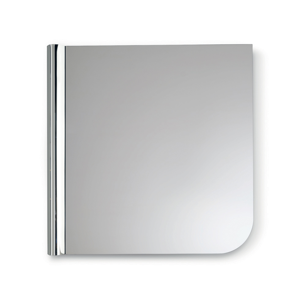 O formato do espelho é caracterizado por linhas limpas com um canto arredondado que suaviza o perfil do vidro. Em contraste com essa geometria essencial, uma onda de vidro fundido percorre uma das laterais verticais, um detalhe texturizado que confere dinamismo à superfície e cria um elegante jogo de luz e reflexos.
