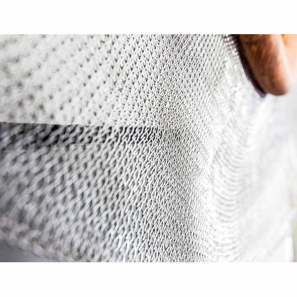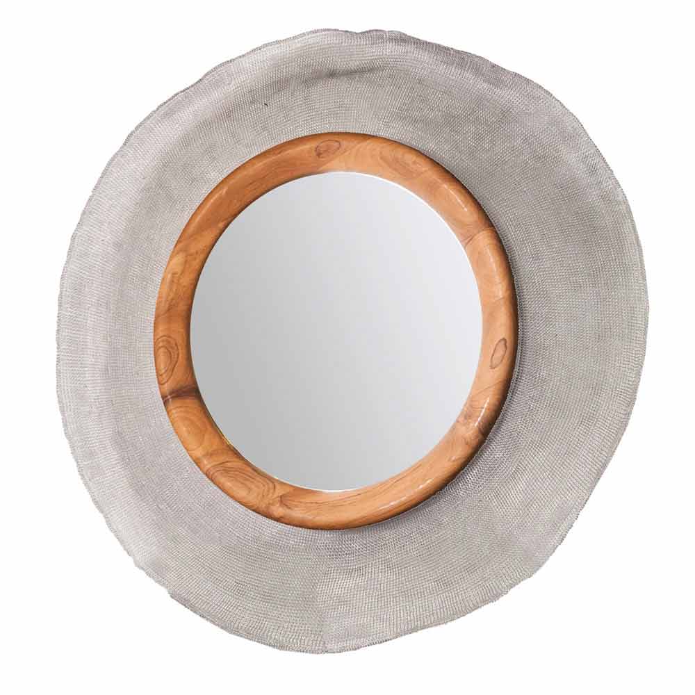 Feito com uma malha de metal tecida à mão e aplicada ao longo da moldura de teca polida do espelho; a malha de arame pode ser moldada de acordo com seu prazer.