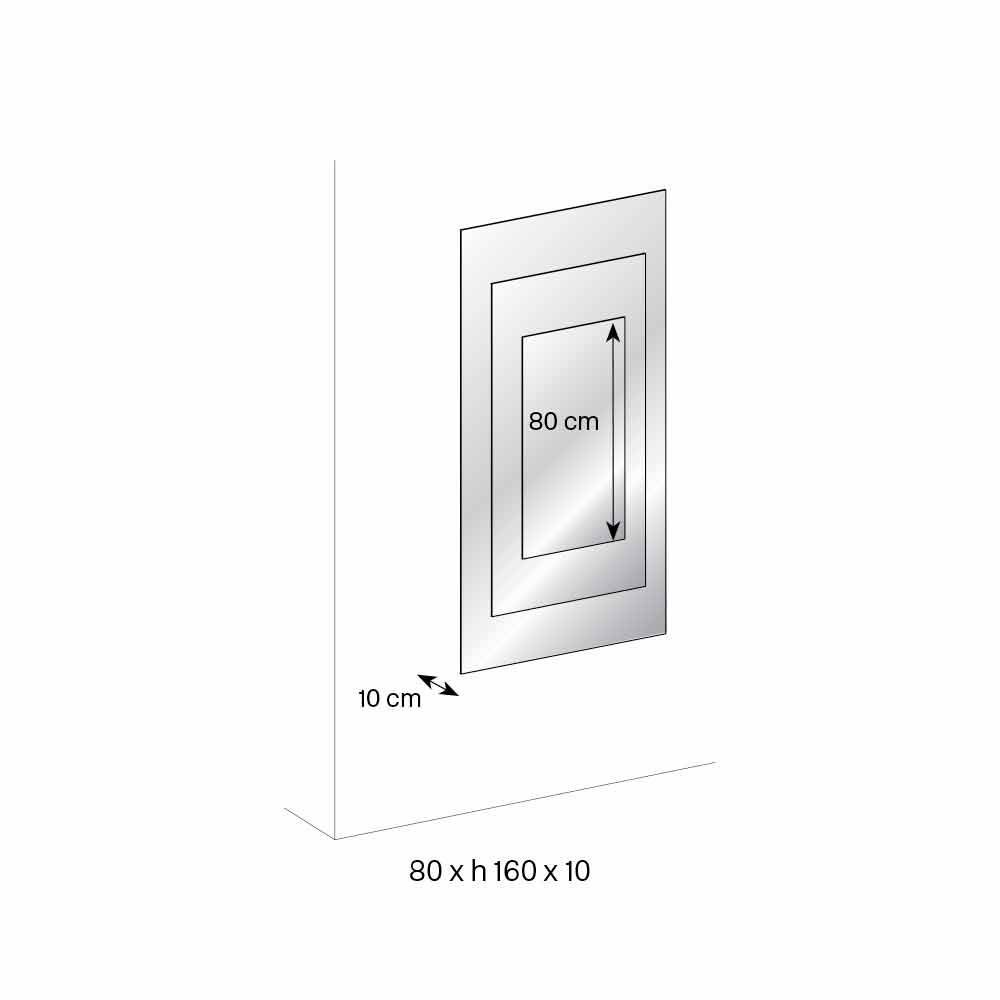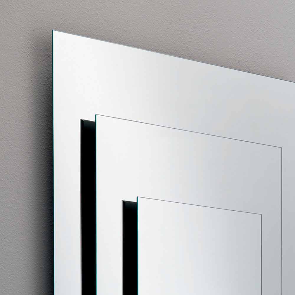 Este espelho de parede é composto por três placas sobrepostas e espaçadas suportadas por uma estrutura de madeira preta .