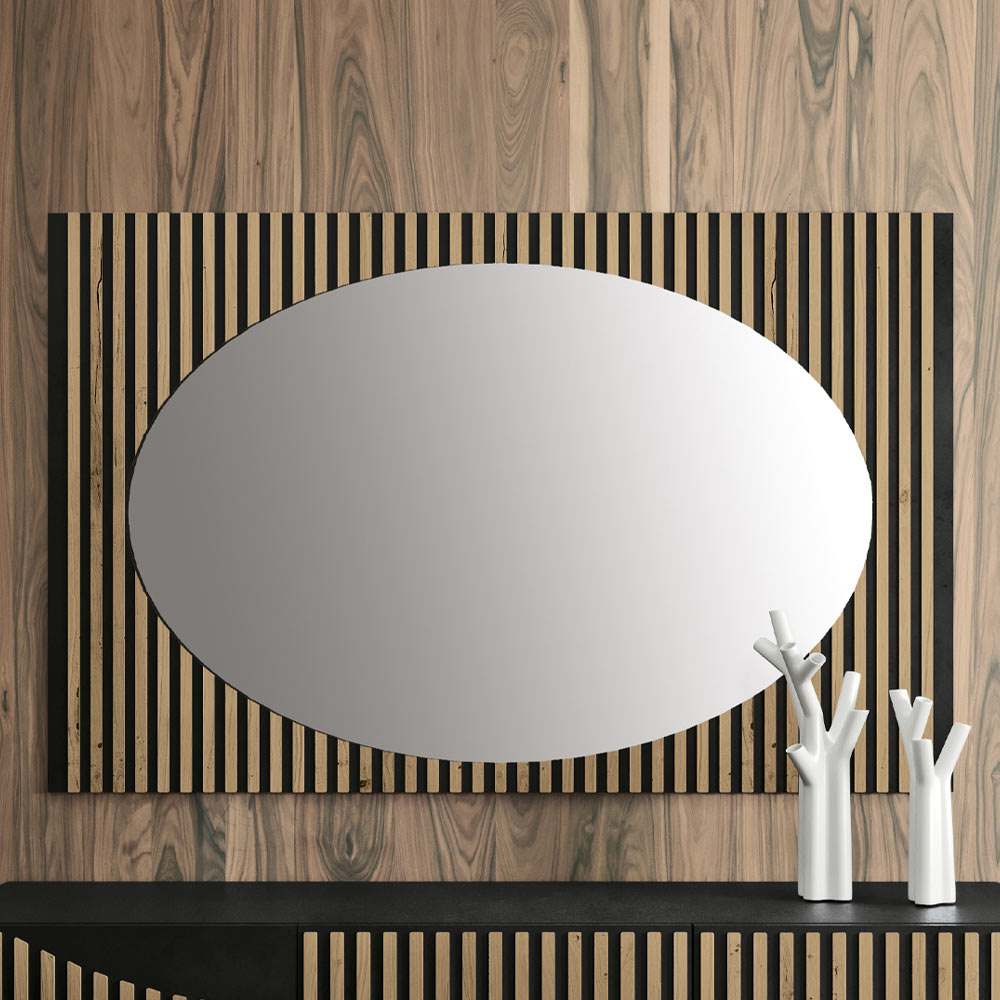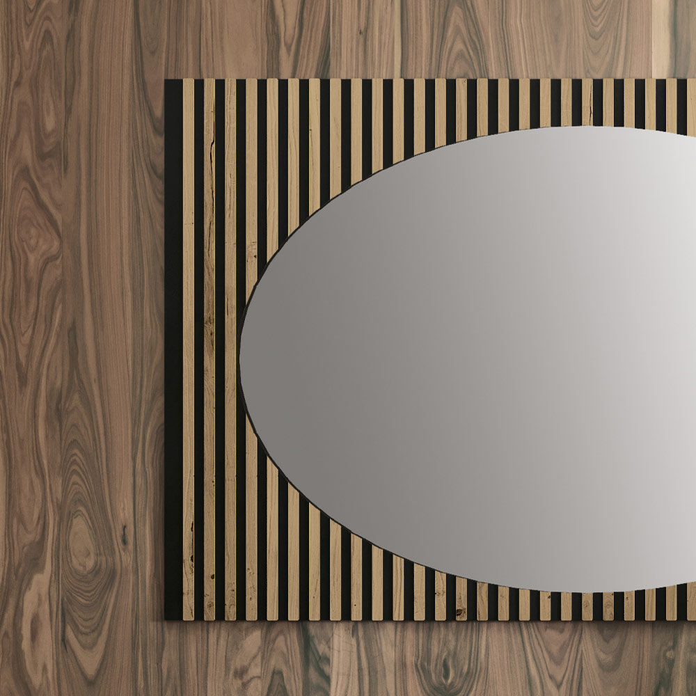 Praticidade e estética se unem neste espelho de parede fabricado na Itália com materiais de alta qualidade . O painel é feito de MDF nervurado de carvalho com acabamento em carvalho nórdico e carvão .