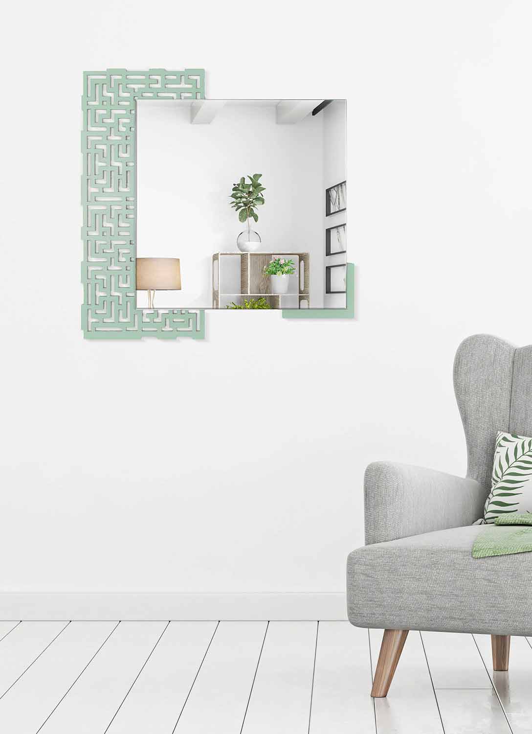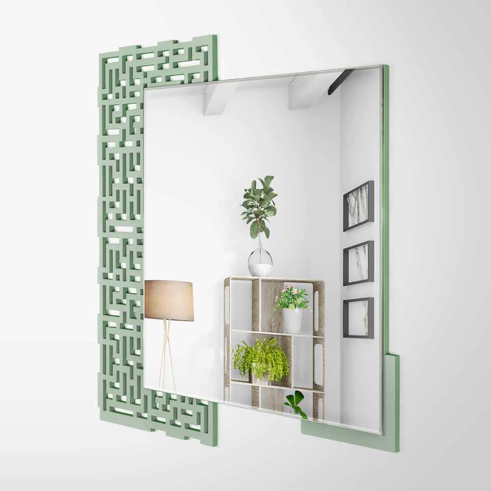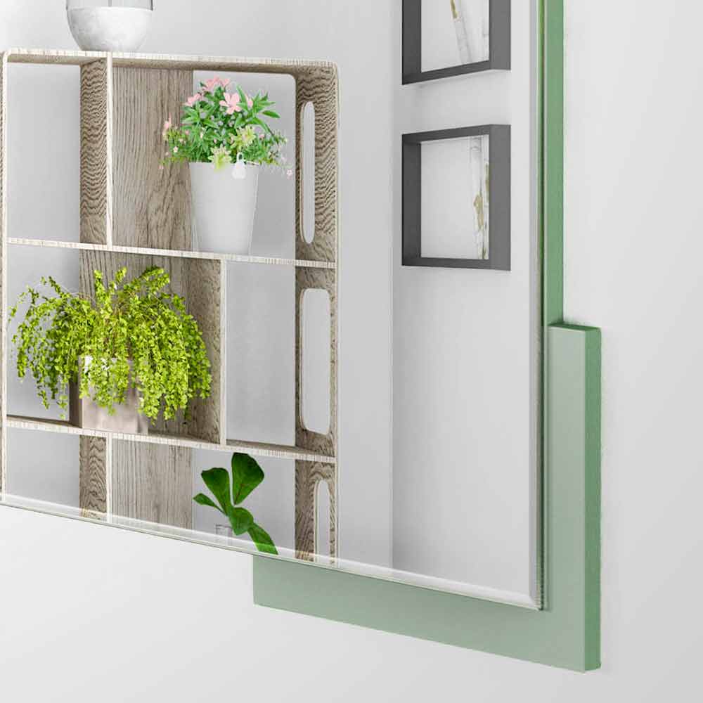 Espelho de parede moderno, desenho geométrico quadrado, em madeira verde e fabricado na Itália.