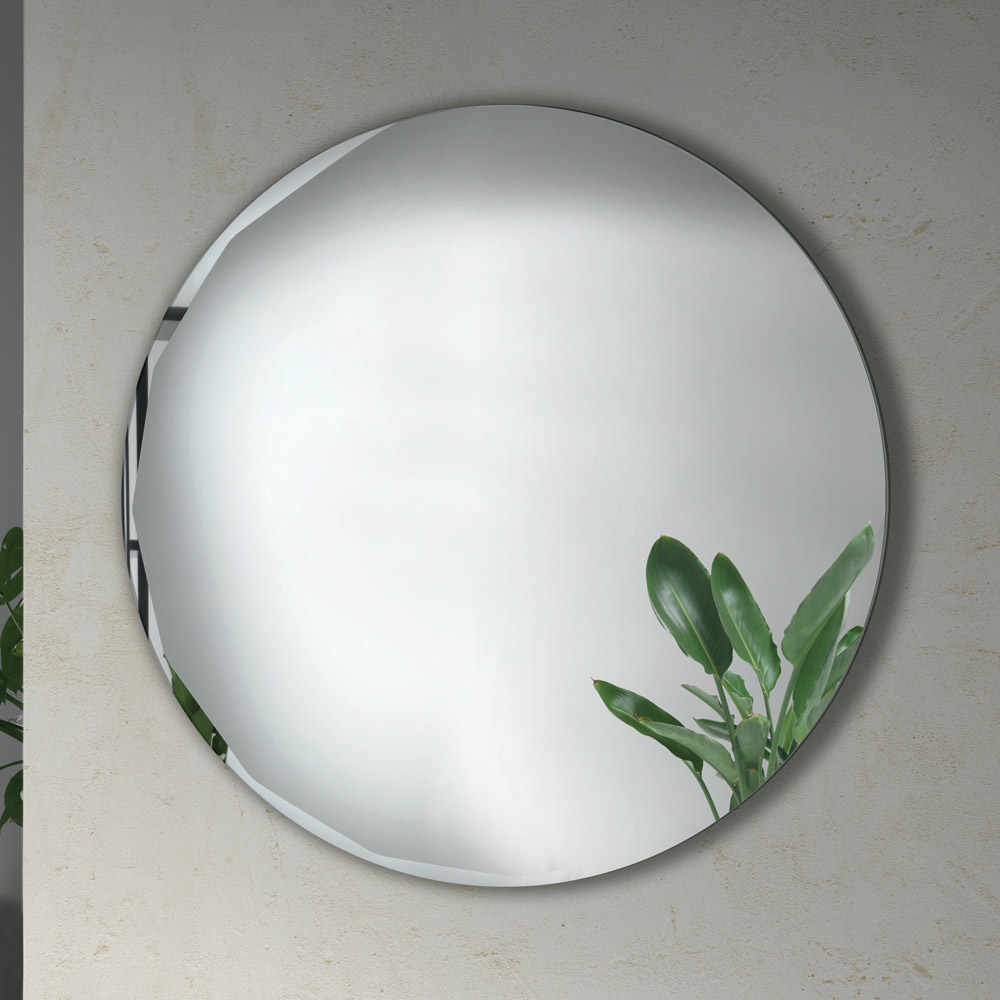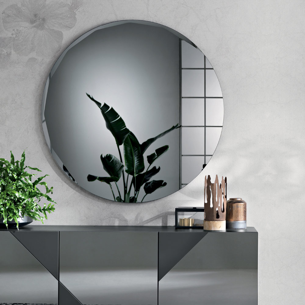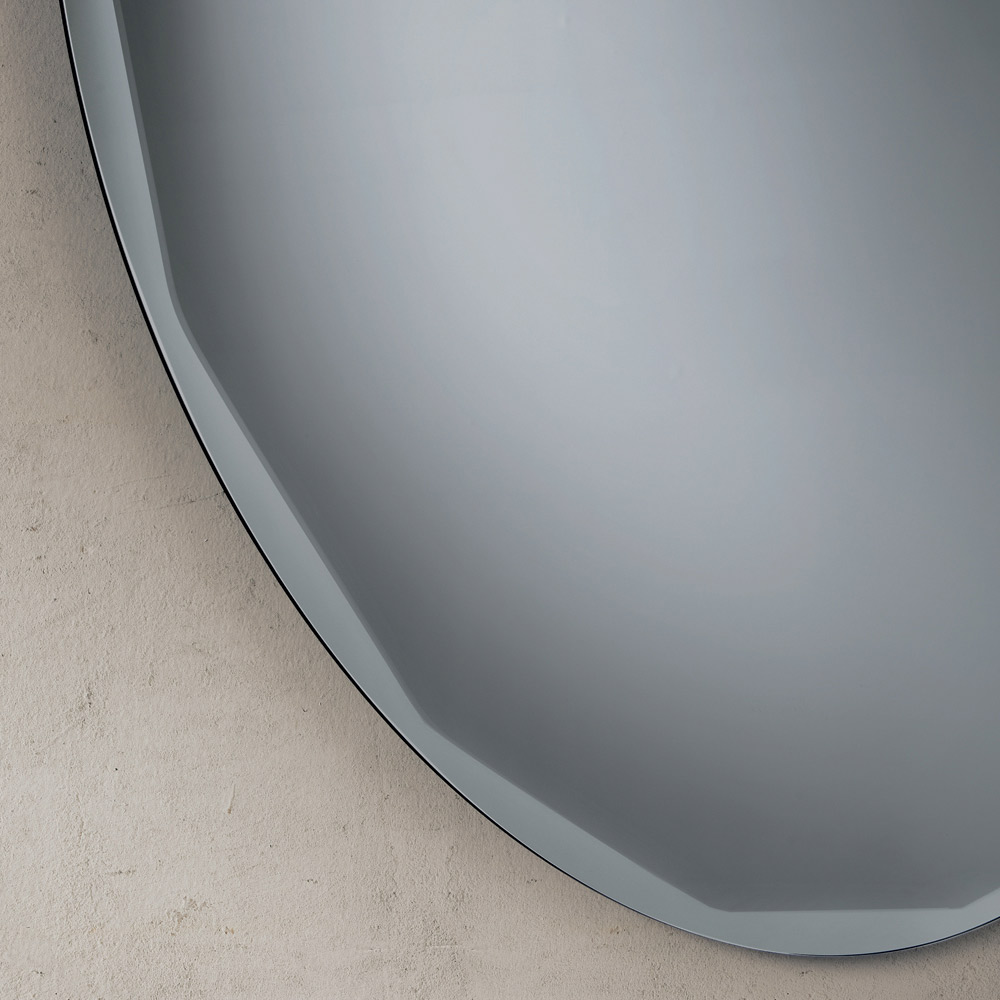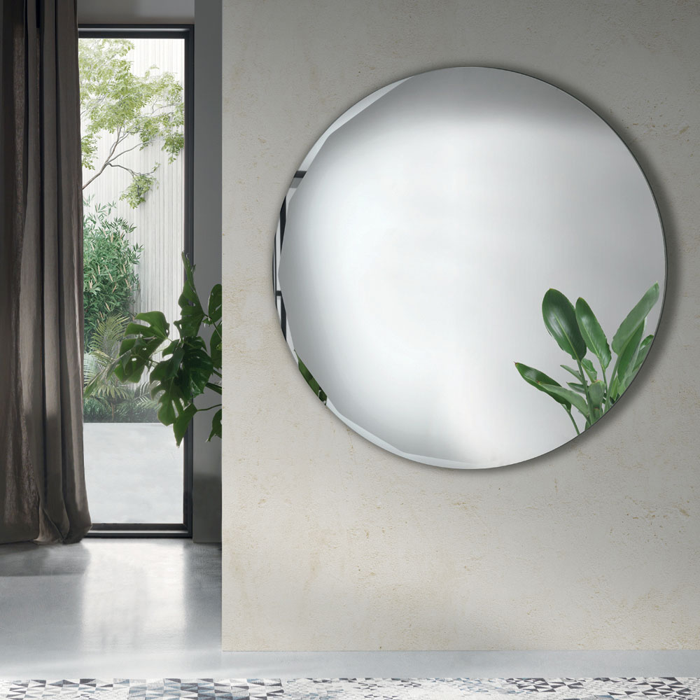 O espelho apresenta um formato redondo puro , adornado com um bisel lateral refinado que realça seu perfil e complementa o design minimalista. Esse detalhe cria um delicado jogo de reflexos ao longo da borda, conferindo profundidade e luminosidade à superfície.