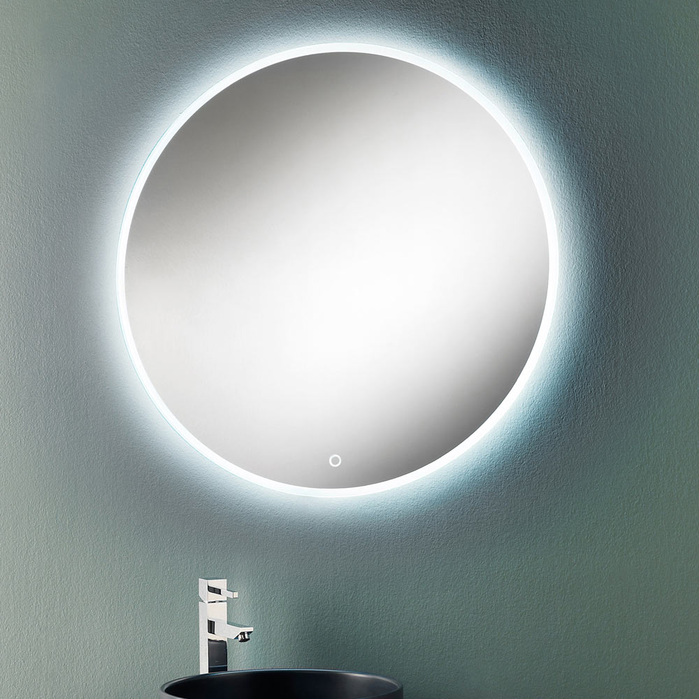Espelho redondo de parede para banheiro de design moderno com borda jateada e retroiluminada, fabricado na Itália.