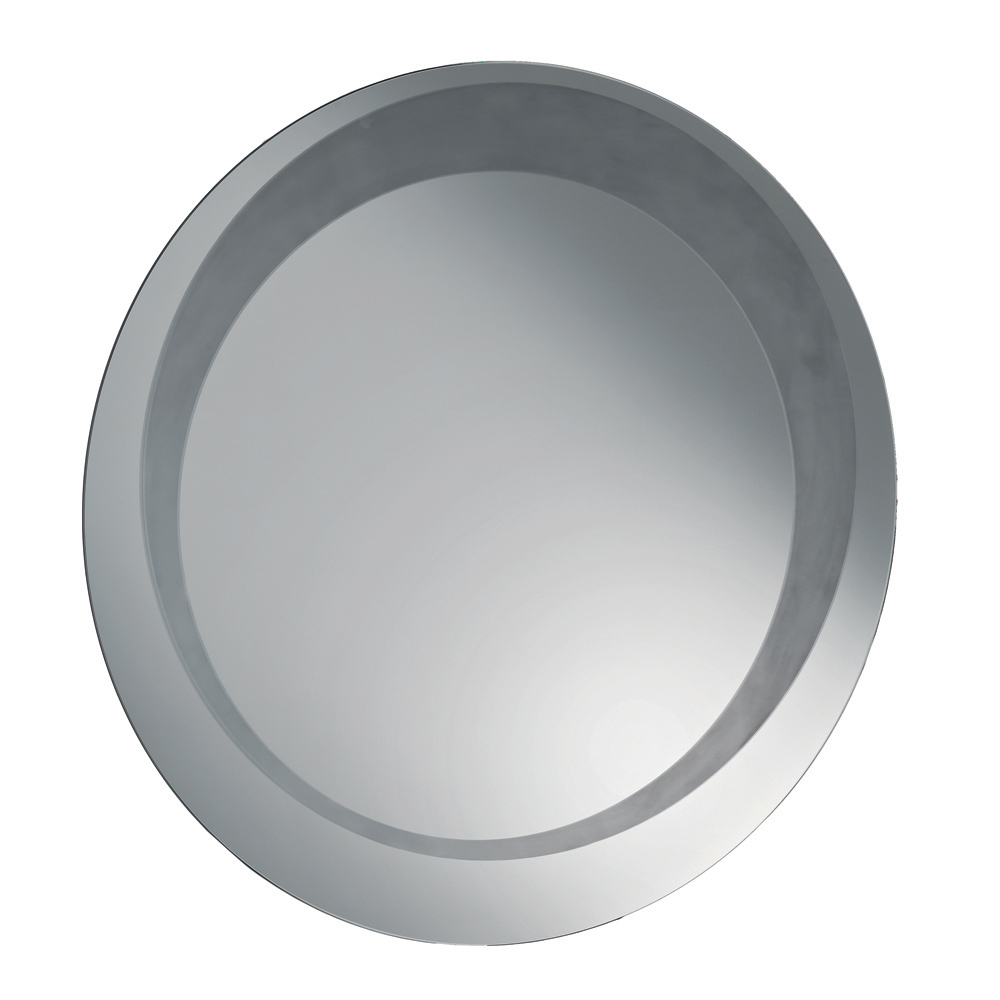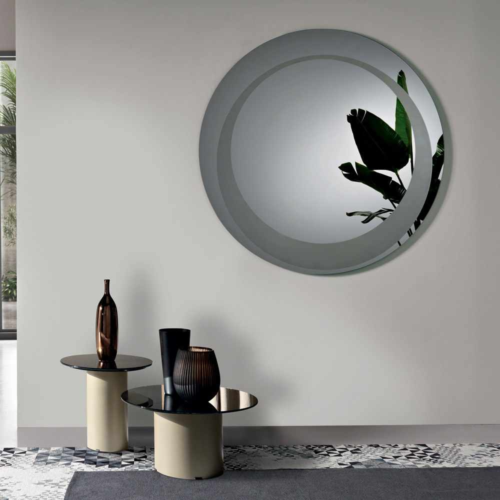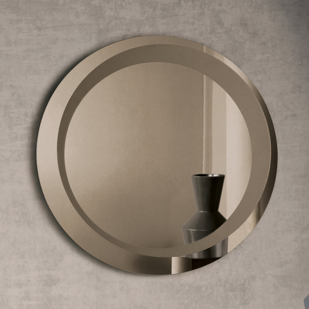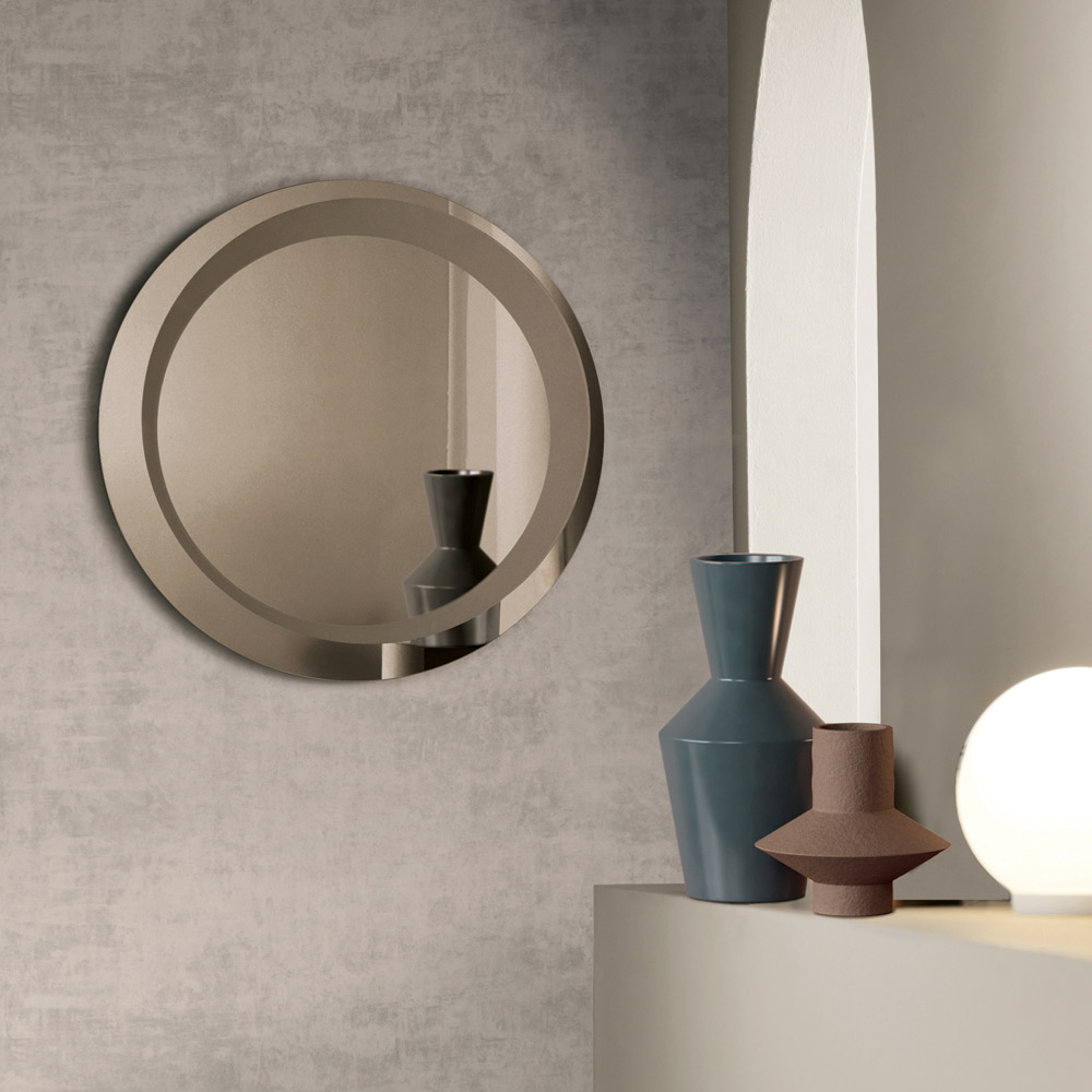 O espelho apresenta um formato redondo adornado com uma decoração jateada tom sobre tom que forma um círculo descentralizado de espessura variável . Esse detalhe gráfico cria uma interação refinada de superfícies e reflexos, adicionando profundidade e personalidade ao design do espelho.