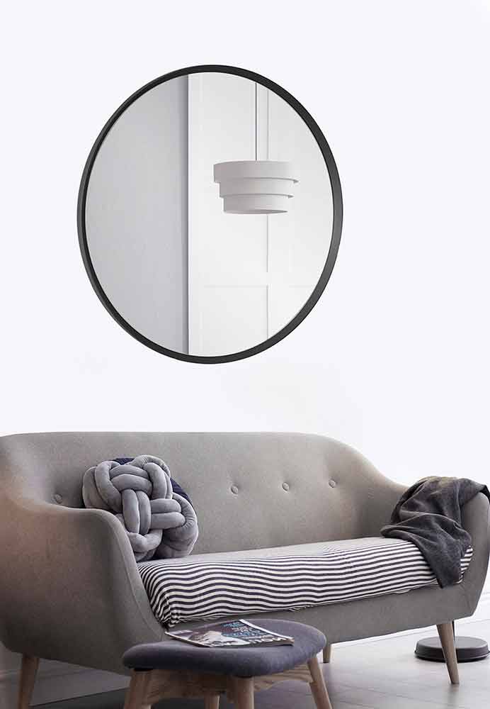 espelho de parede com moldura inclinada para dentro apresenta linhas elegantes e formas modernas combinadas com um acabamento envernizado refinado para um resultado com um impacto estético mínimo e decorativo, em um estilo único.