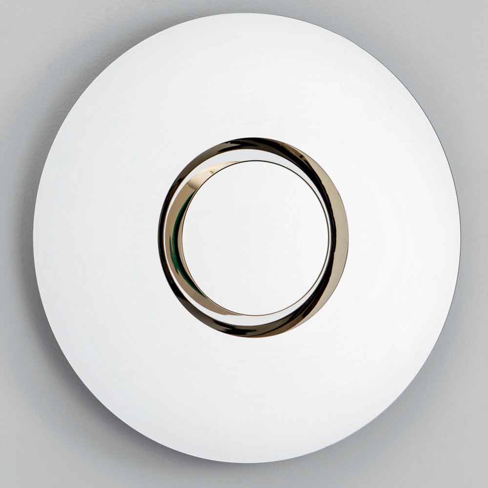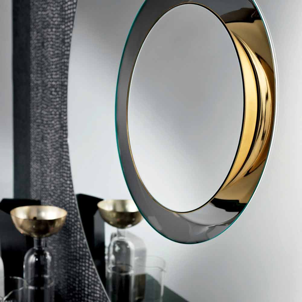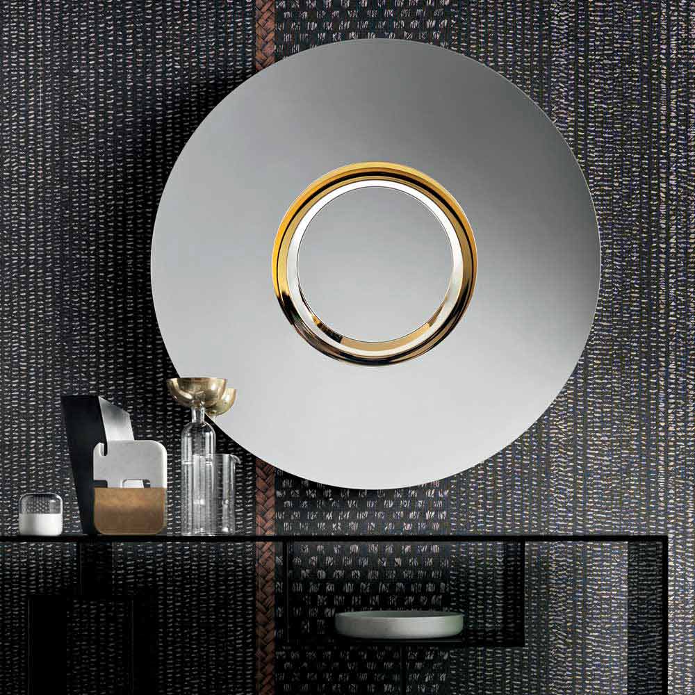 O espelho de parede tem um desenho redondo e caracteriza-se pela parte central amovível que o torna original e único: trata-se de um móvel circular e concêntrico com um círculo central em metal dourado que também pode ser utilizado como centro de mesa.