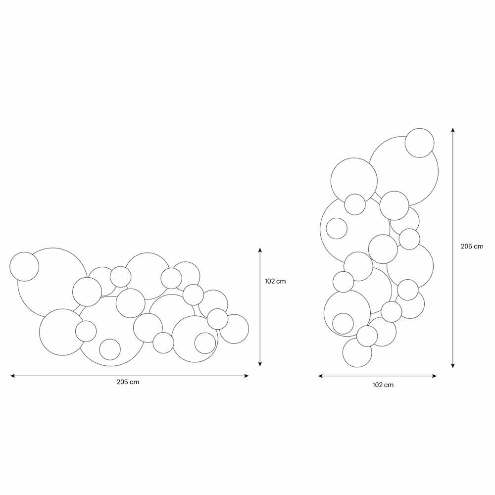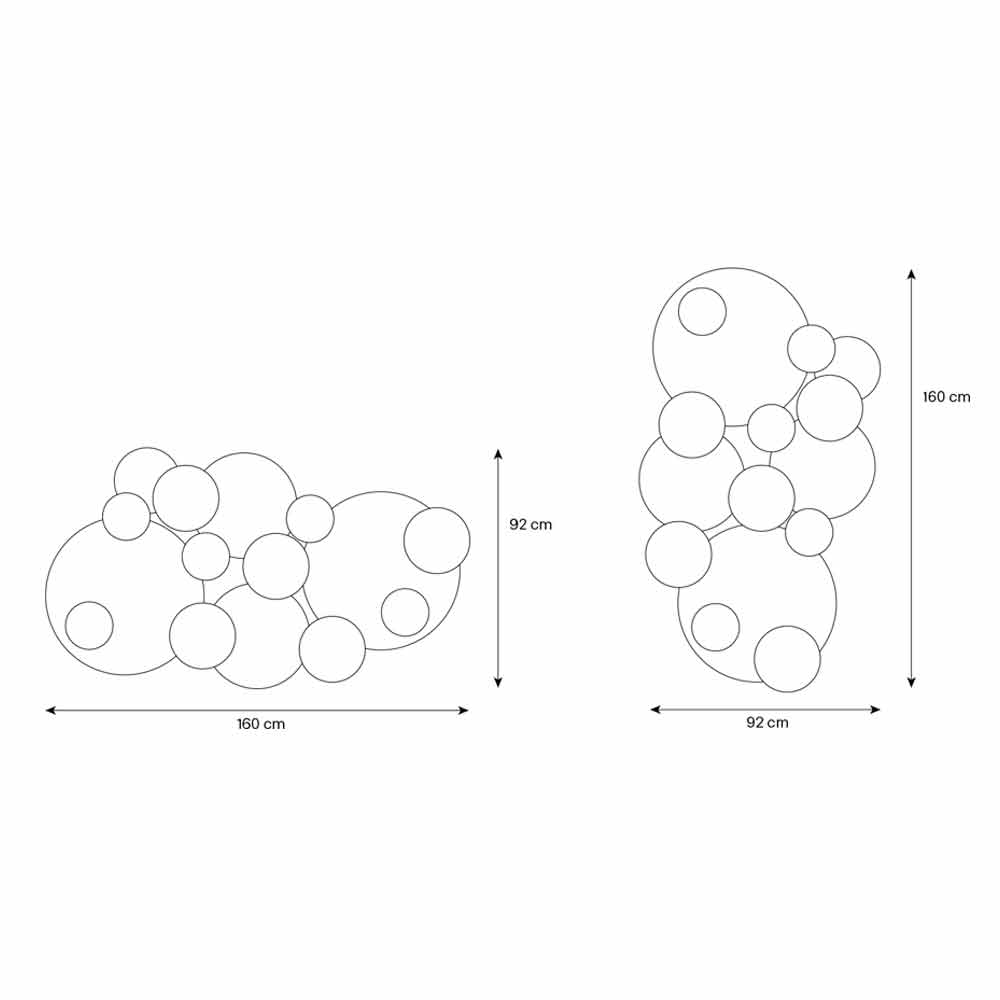 O espelho de parede é composto por uma série de elementos espelhos circulares de diferentes tamanhos e acabamentos : espelho, fumê, bronze, ouro, rosa e cinza.