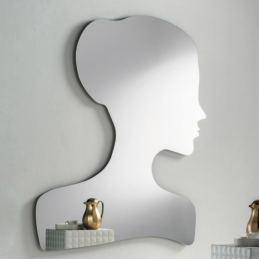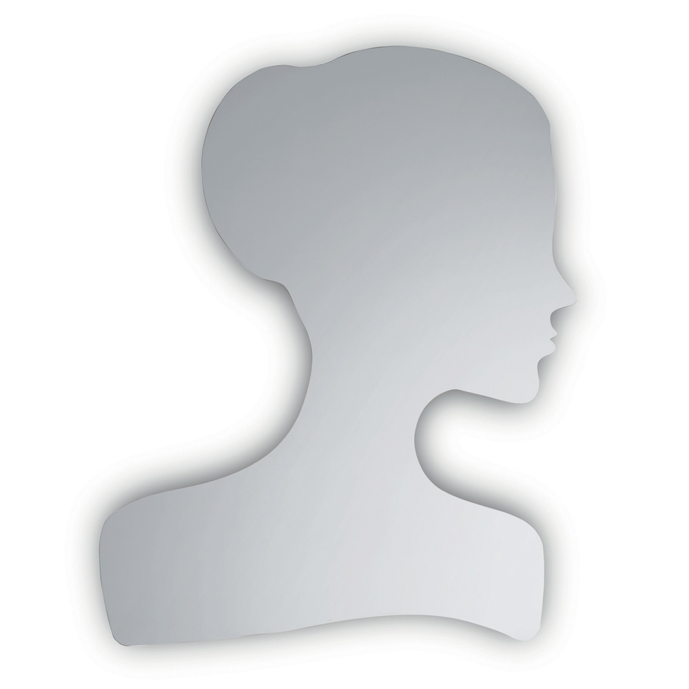 O formato do espelho reproduz o perfil estilizado de um rosto feminino , caracterizado por um coque alto , um pescoço esguio e ombros à mostra . Essa silhueta delicada cria uma presença elegante e marcante, transformando o espelho em um elemento de decoração com forte impacto visual.