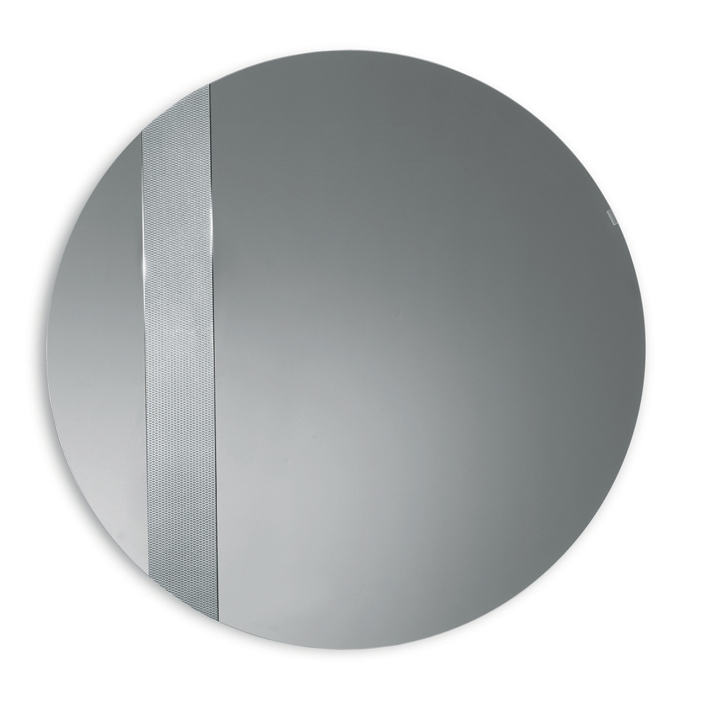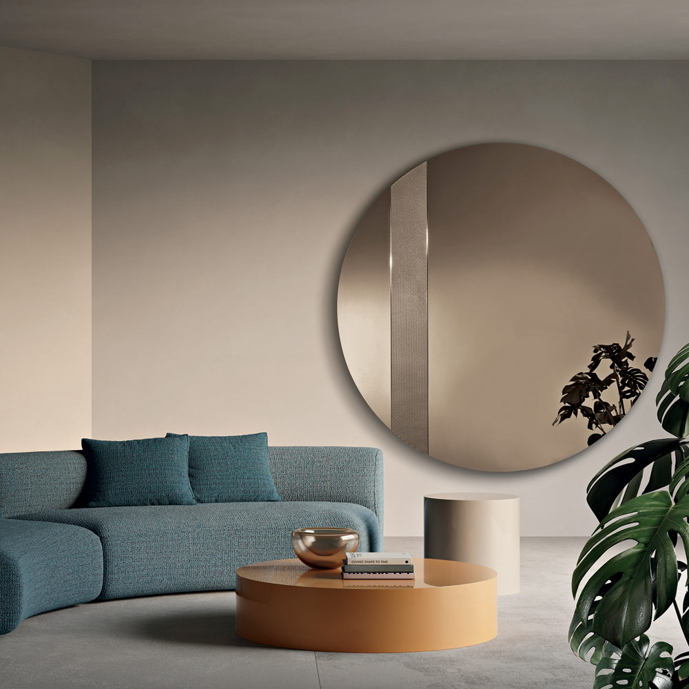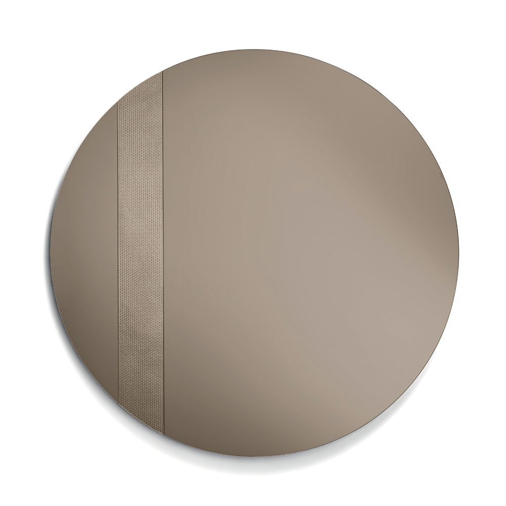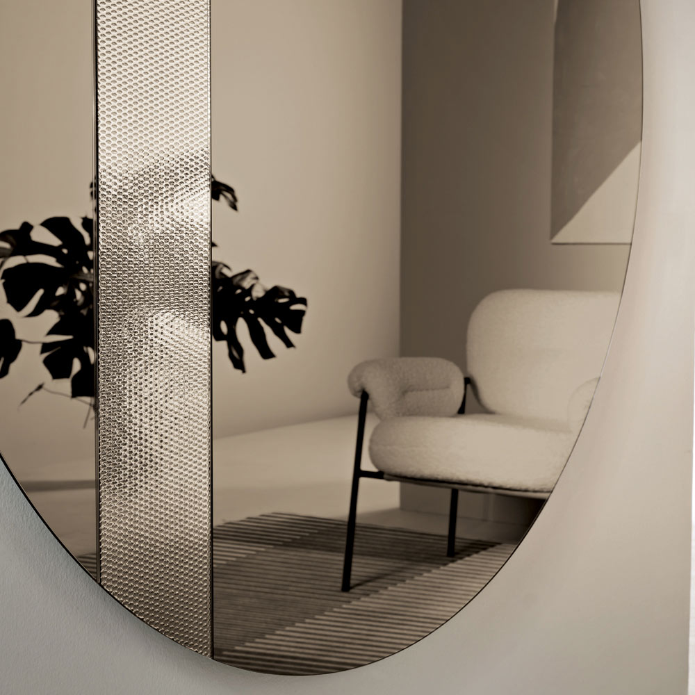 O espelho apresenta um formato redondo adornado com uma lateral de vidro com uma decoração em malha tom sobre tom . Este detalhe gráfico captura a luz e cria um elegante jogo de reflexos, adicionando profundidade e movimento à superfície refletora.