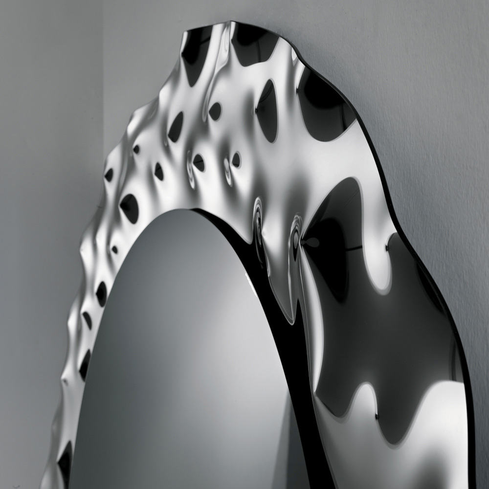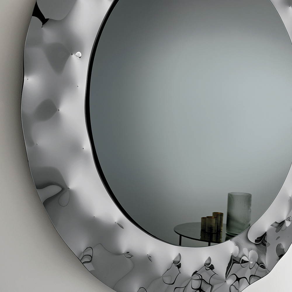 A superfície refletora é embelezada com uma moldura de vidro curvada tom sobre tom que percorre a borda do espelho, criando uma elegante interação de luz e textura. O acabamento exclusivo do vidro adiciona profundidade e movimento à composição, realçando o visual contemporâneo da peça.