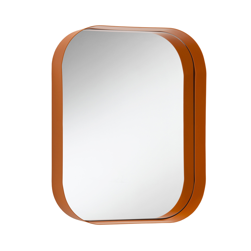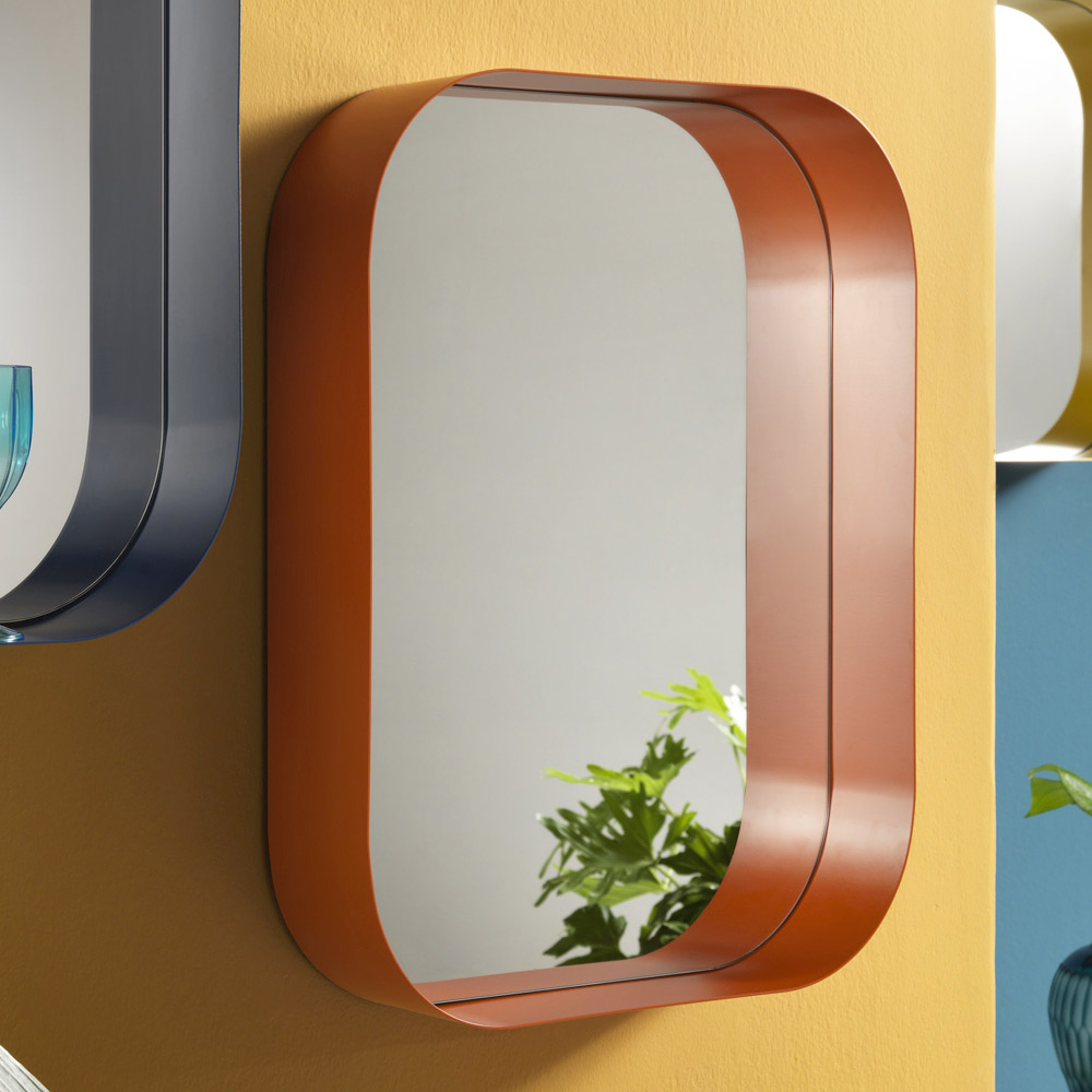 Este grande e simpático espelho de parede, de desenho retangular com cantos arredondados, caracteriza-se pelo rebordo metálico que emoldura o espelho e funciona como uma prateleira prática e colorida de 12,50 cm.