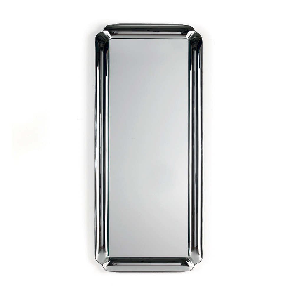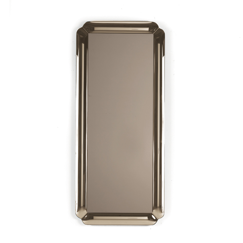 O espelho apresenta um formato retangular adornado com uma moldura de cristal fundido tom sobre tom, com cantos delicadamente trabalhados . A placa refletora repousa sobre a moldura, criando um jogo de profundidade refinado que realça a superfície e confere leveza à composição.