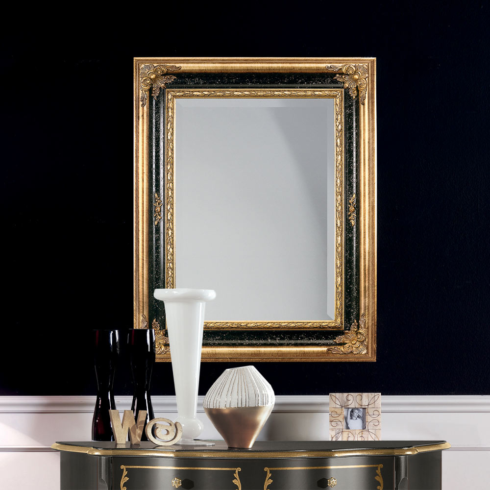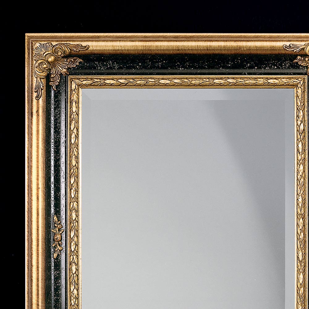 Elegante espelho retangular com moldura de madeira decorado com folha de ouro e laca preta. Graças ao seu estilo clássico , este espelho é ideal para dar a qualquer ambiente um toque elegante e luxuoso .