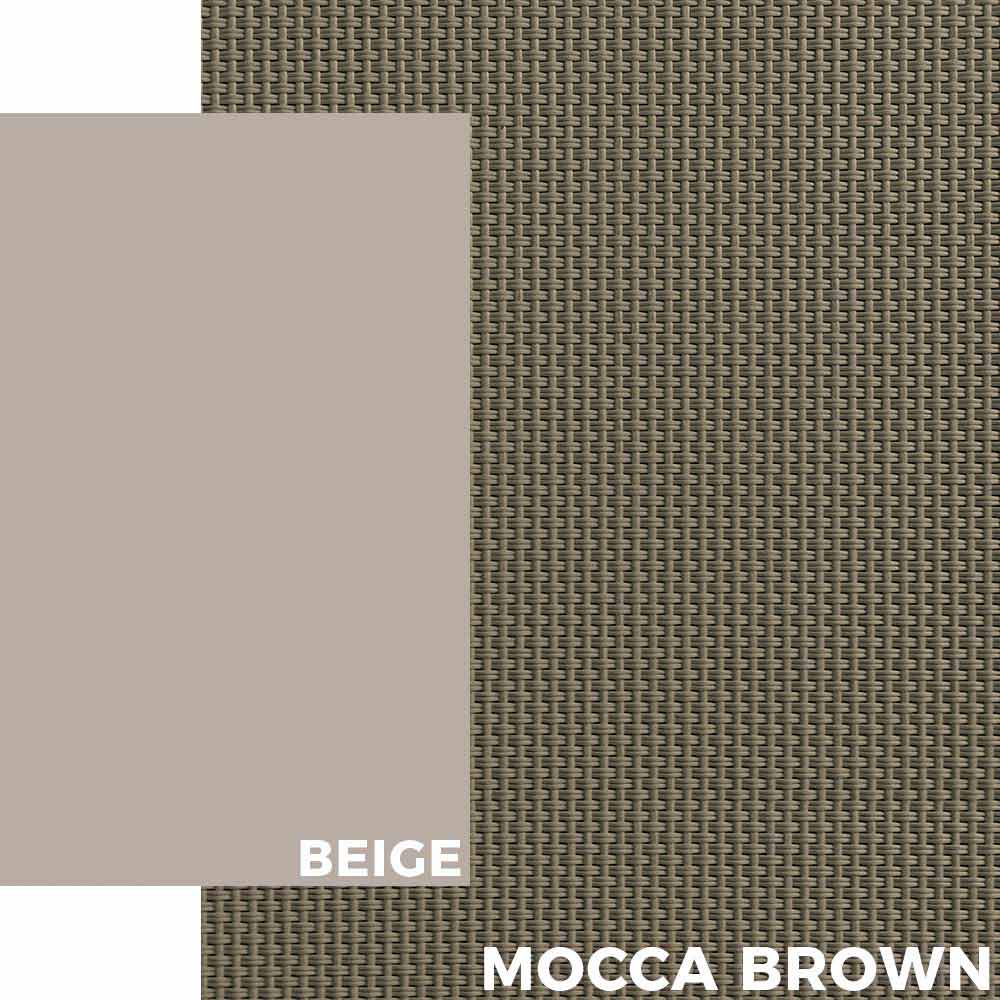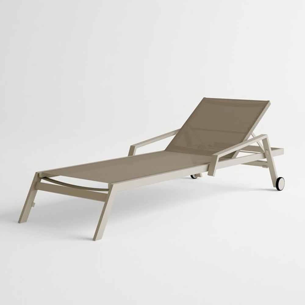 Espreguiçadeira ao ar livre, estrutura em alumínio e textilene, design moderno com rodas e braços.