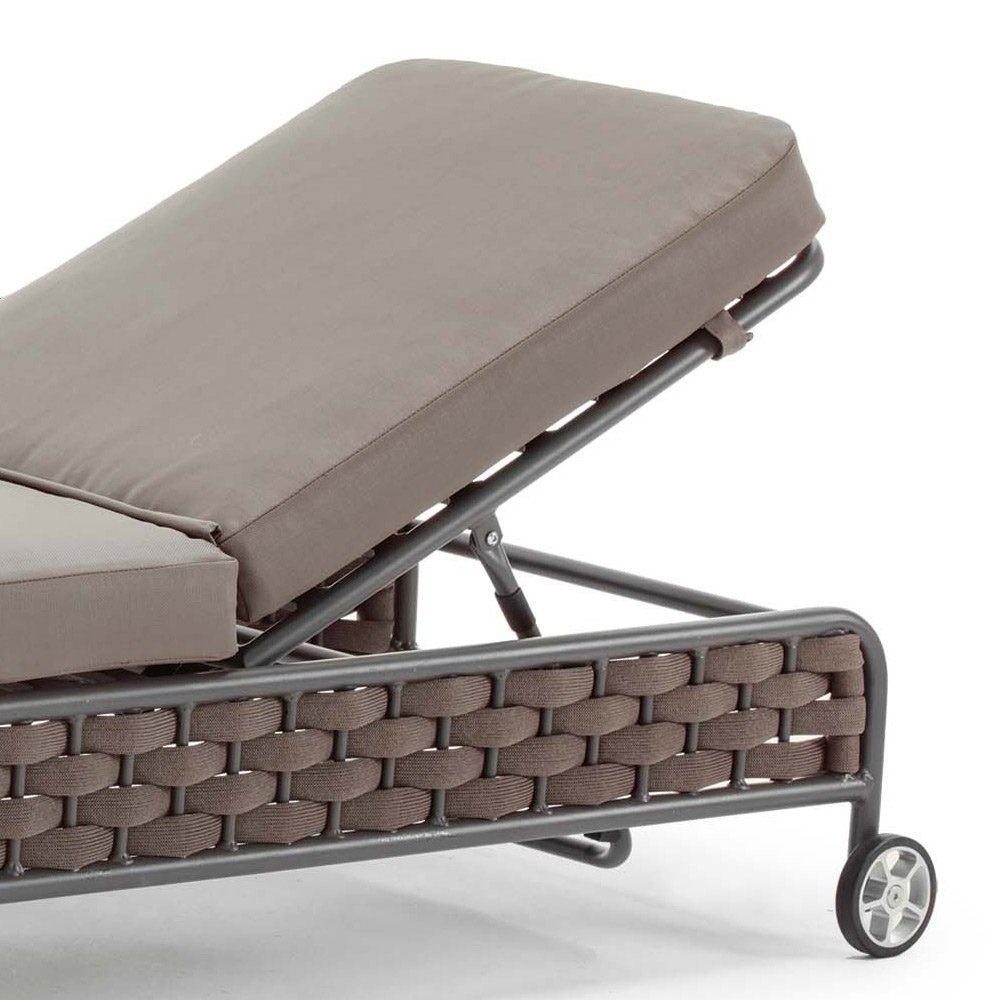 Chaise longue de jardim com estrutura interna em alumínio pintado de antracite envolta em elegante trama em corda de poliéster com acabamento castanho e almofadas removíveis em borracha hidrorrepelente revestida em tecido acrílico de cor castanha.