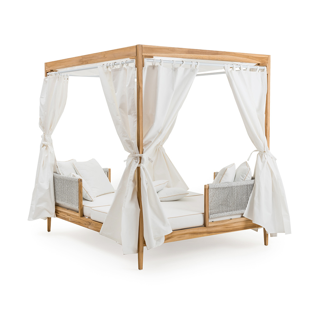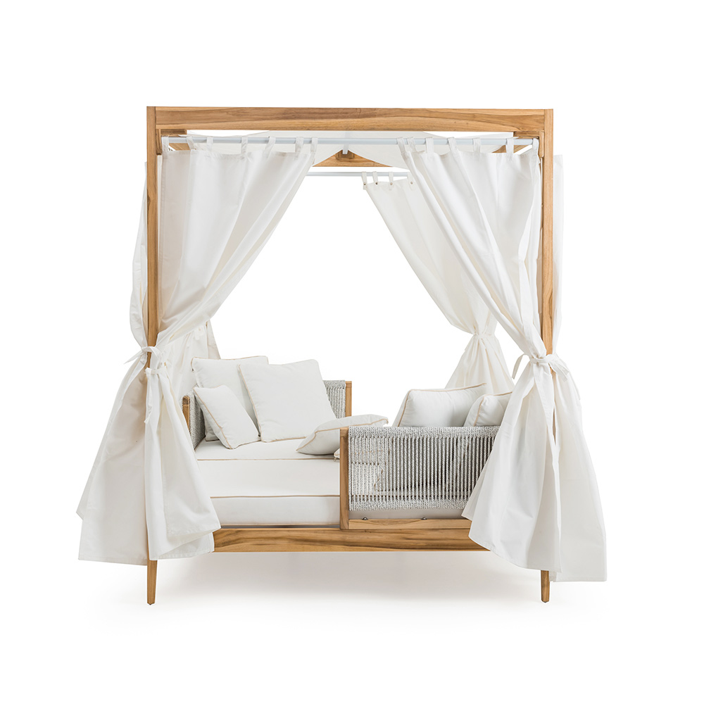 Um cama de dia projetado para aqueles que procuram um estilo sóbrio e elegante que pode dar aos seus espaços ao ar livre um toque de frescura. Este dossel presta-se a enriquecer impecavelmente jardins, terraços e alpendres, revelando-se também perfeito junto à piscina onde cria uma maravilhosa atmosfera acolhedora e uma perfeita harmonia com o ambiente envolvente. O seu design requintado torna-o um complemento perfeito para completar com carácter e estilo qualquer espaço exterior, tanto privado como contratual, dando vida a um mobiliário exclusivo e detalhado.