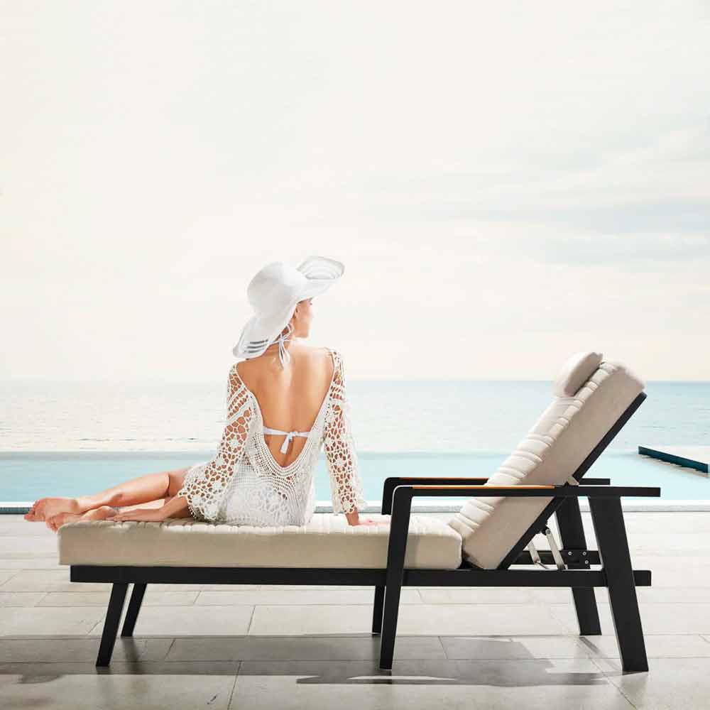 Espreguiçadeira reclinável de alumínio chaise longue com braços e apoio de cabeça em teca.