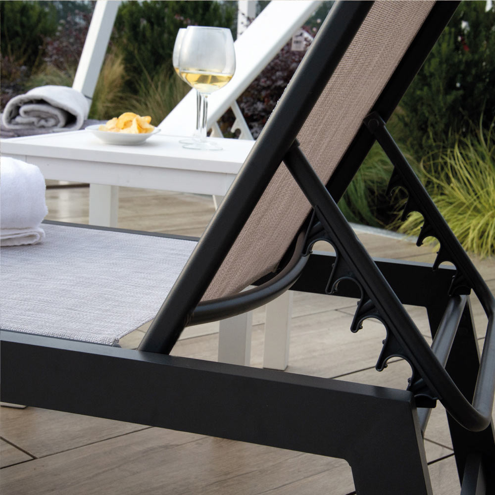 O tecido Textilene não é apenas durável e fácil de limpar, mas também oferece um conforto excecional, permitindo-lhe desfrutar de horas de relaxamento sem compromisso. O encosto ajustável permite-lhe encontrar o ângulo perfeito para cada momento de relaxamento, desde uma leitura tranquila até uma sesta à tarde.
