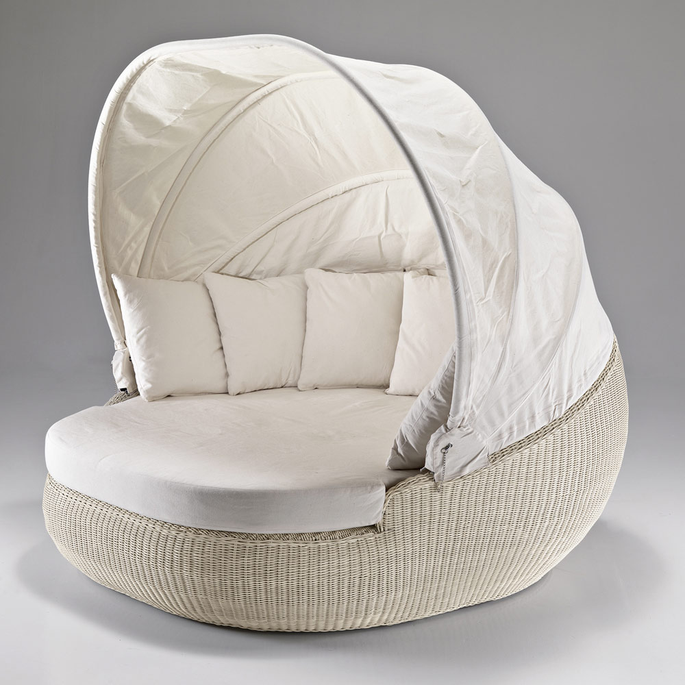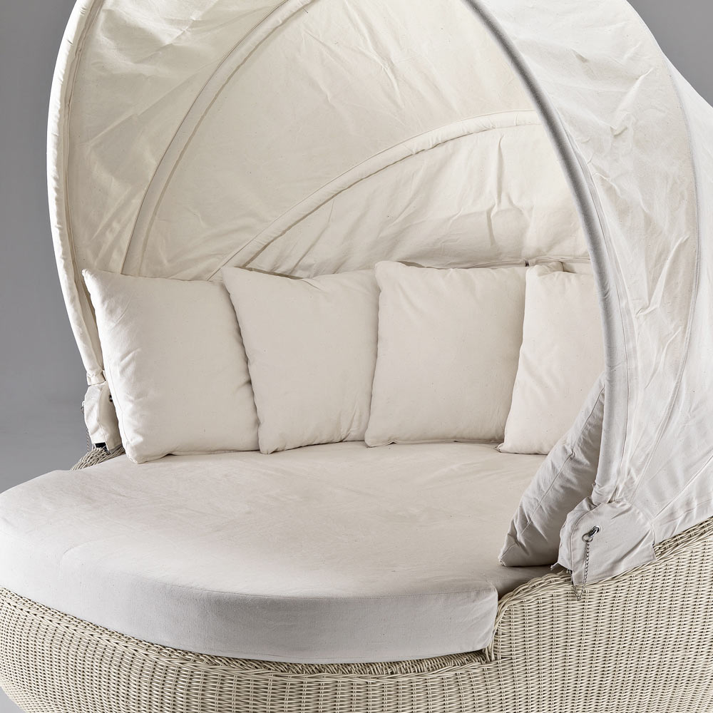 Esta espreguiçadeira é caracterizada pelo seu design circular e tecido completo. Os seus volumes arredondados e sinuosos combinam perfeitamente com o assento grande que lhe permite desfrutar de um relaxamento ideal. A tampa de abertura e fecho torna esta espreguiçadeira original e prática, pois permite-lhe desfrutar tanto da luz solar como da sombra nos momentos mais quentes do dia.