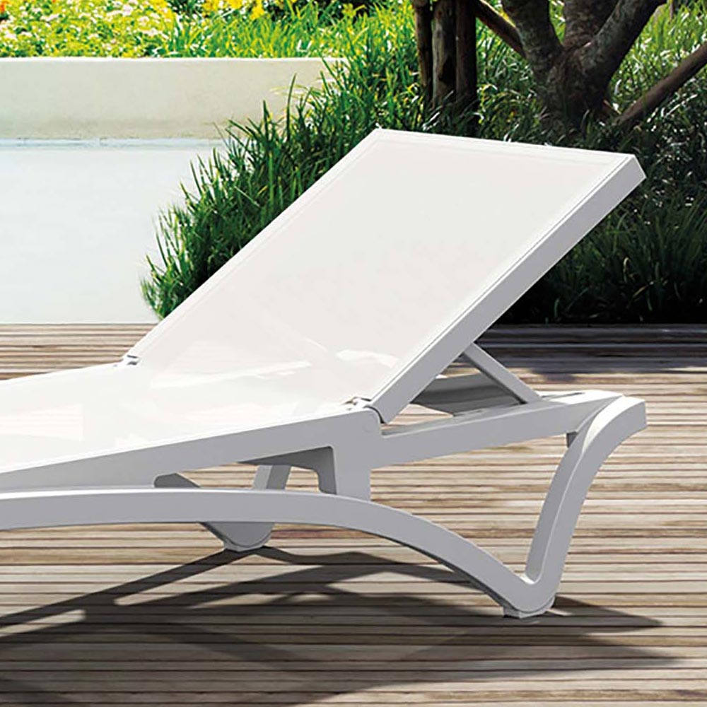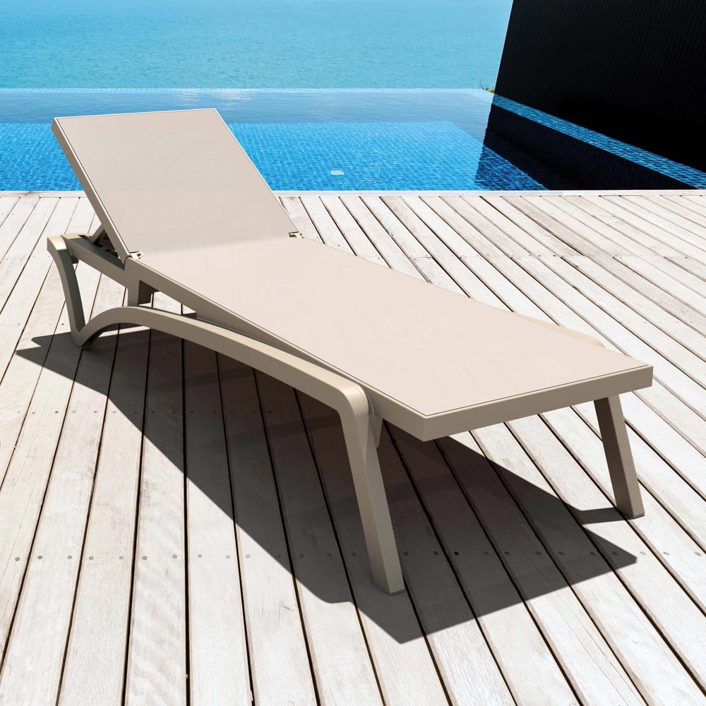 Espreguiçadeira de exterior com estrutura de polipropileno combinada com malha têxtil colorida com encosto reclinável até 5 posições, pés e rodas antiderrapantes.
