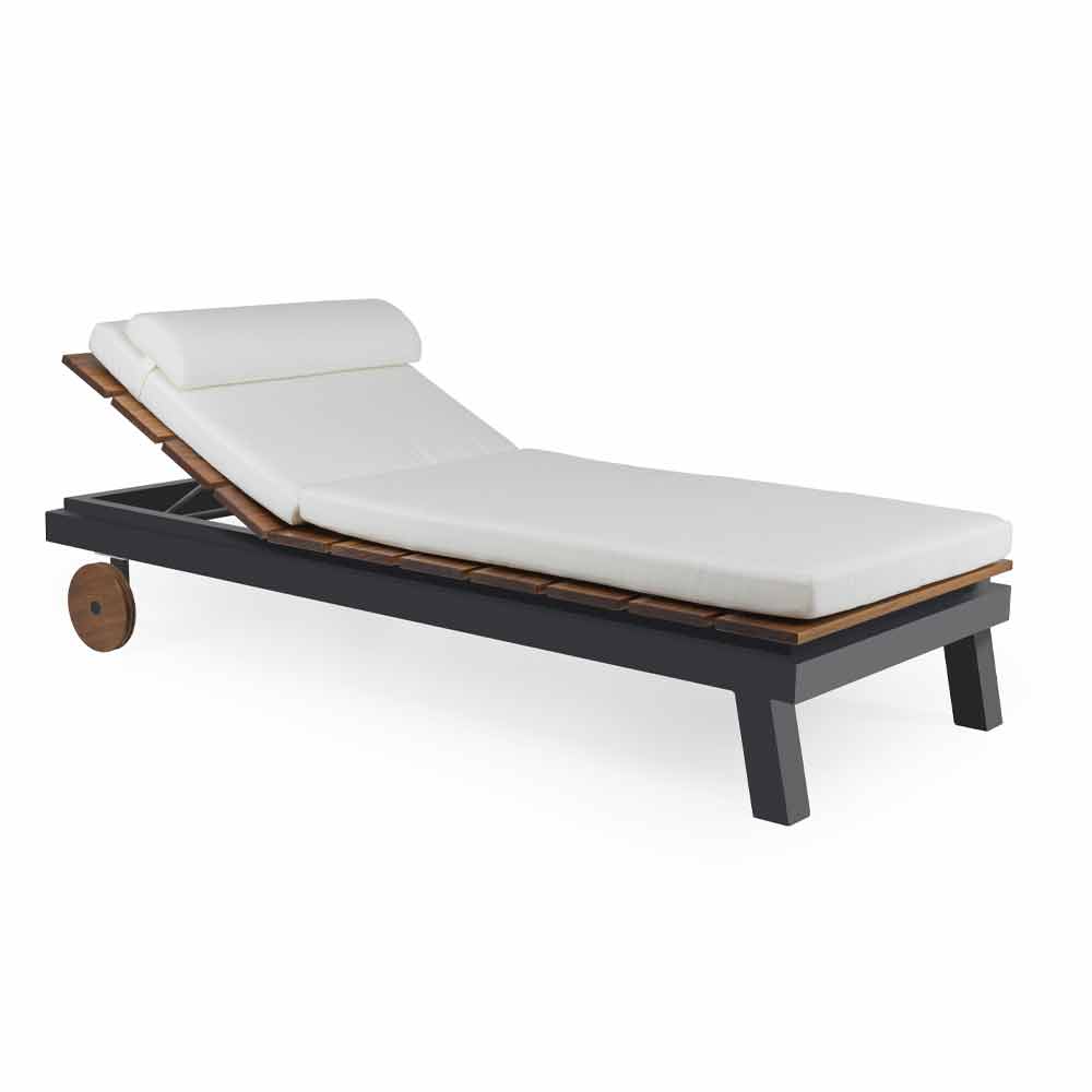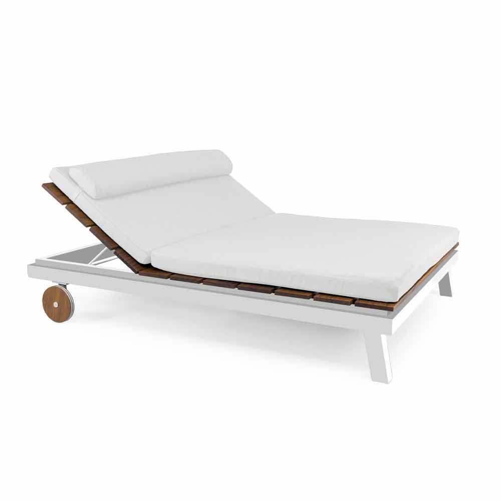 Espreguiçadeira de jardim de desenho simples ou duplo em alumínio branco ou preto, ripas de madeira e rodas e almofadas.