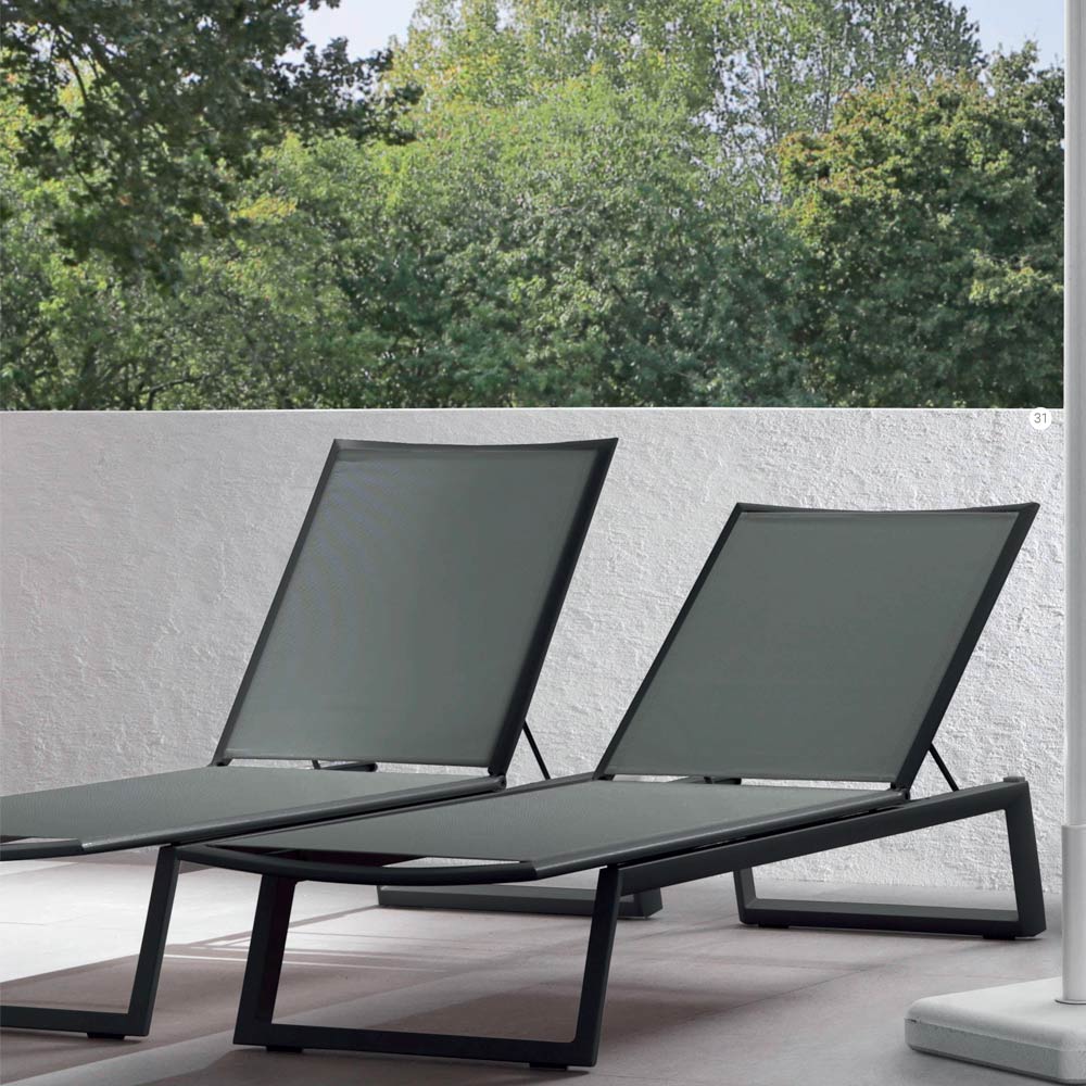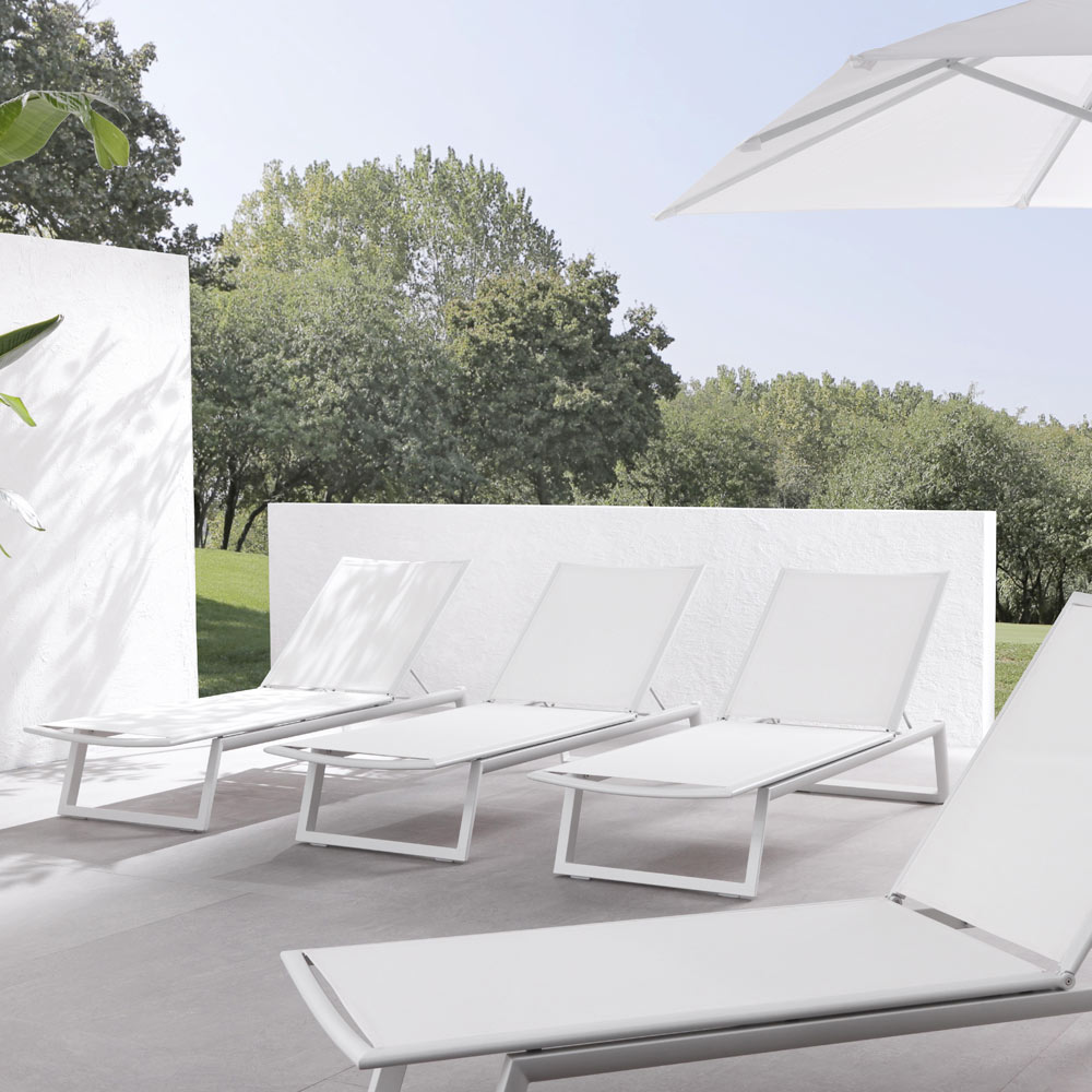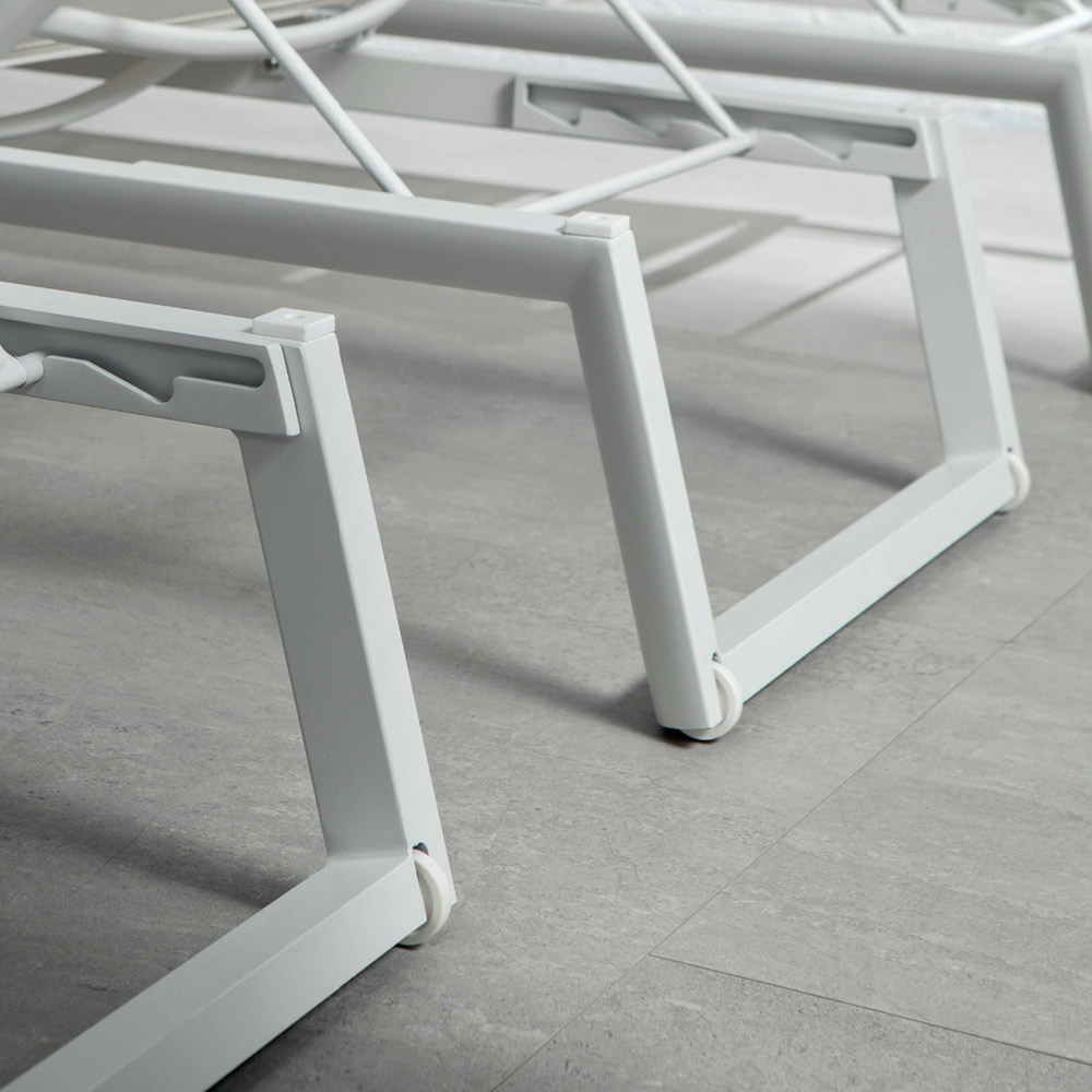 Espreguiçadeira exterior com estrutura em alumínio pintado a pó epóxi combinado com a malha de fabricne com encosto reclinável até 4 posições com rodas retráteis, excelente para garantir grande mobilidade a este produto.