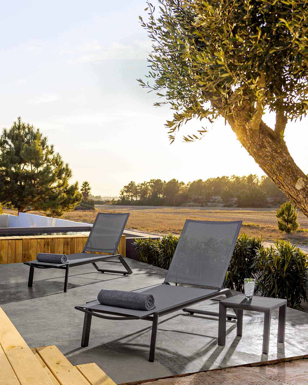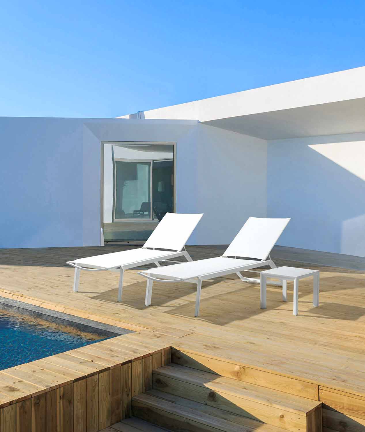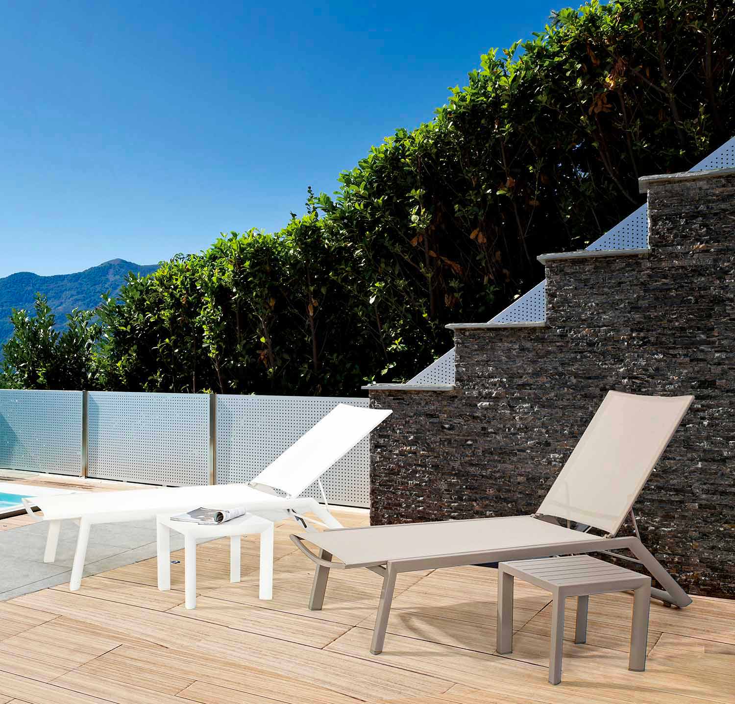 Canteiro de jardim com rodas, reclinável com estrutura de alumínio e assento em textilene branco ou antracite.