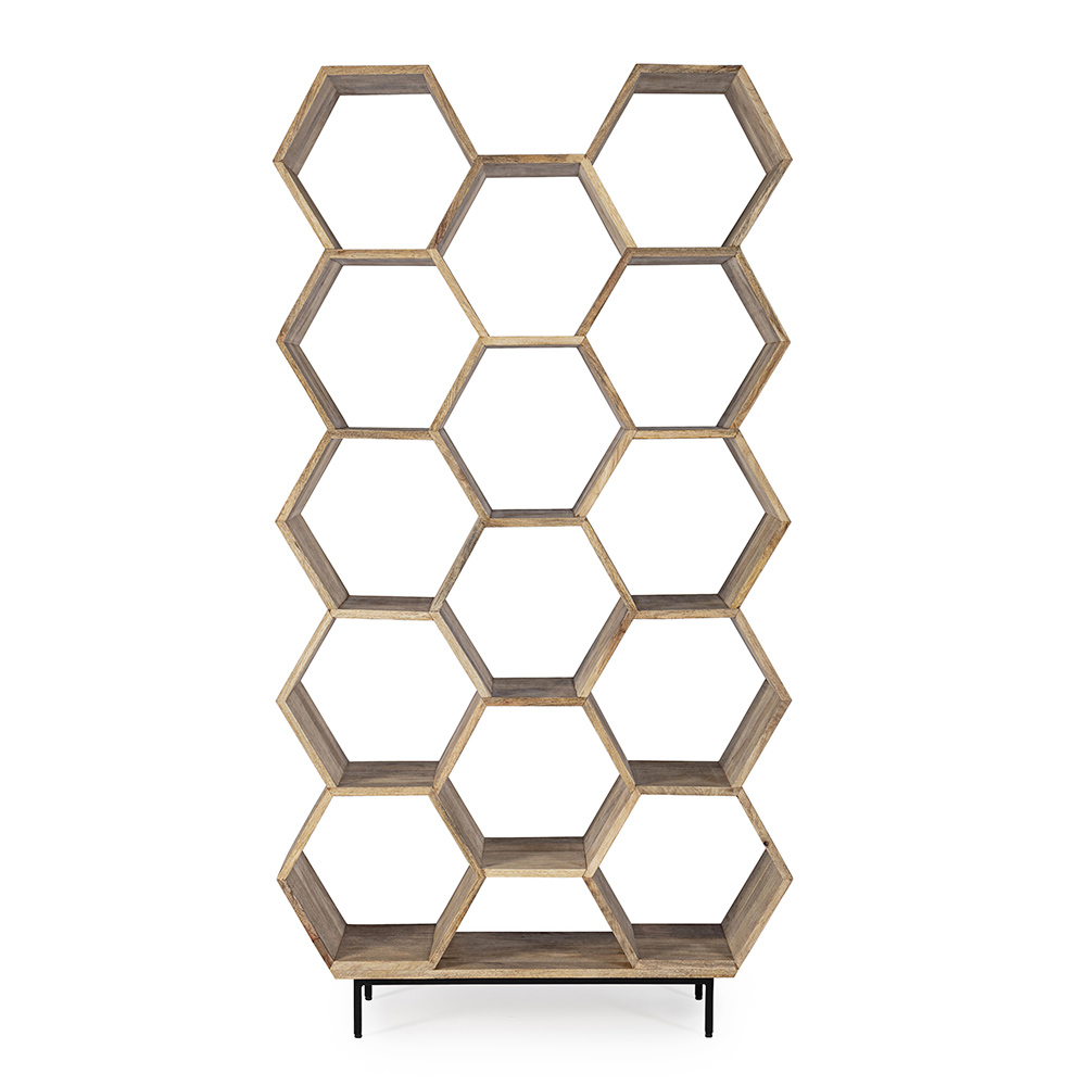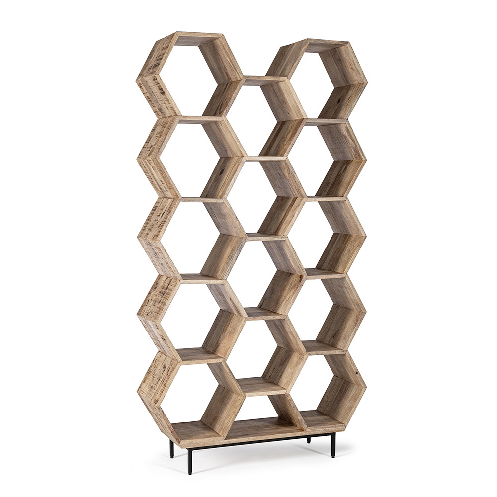 Esta estante de sala de estar apresenta uma moldura de madeira de manga com acabamento em verniz de poliuretano. Base em aço com pintura eletrostática a pó epóxi. O desenho original em forma de um favo de mel particular caracteriza o ambiente com estilo e geometria.