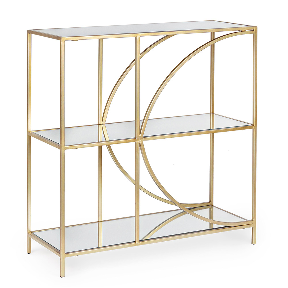 Estante baixa de aço autoportante e 3 estantes de vidro de design elegante.