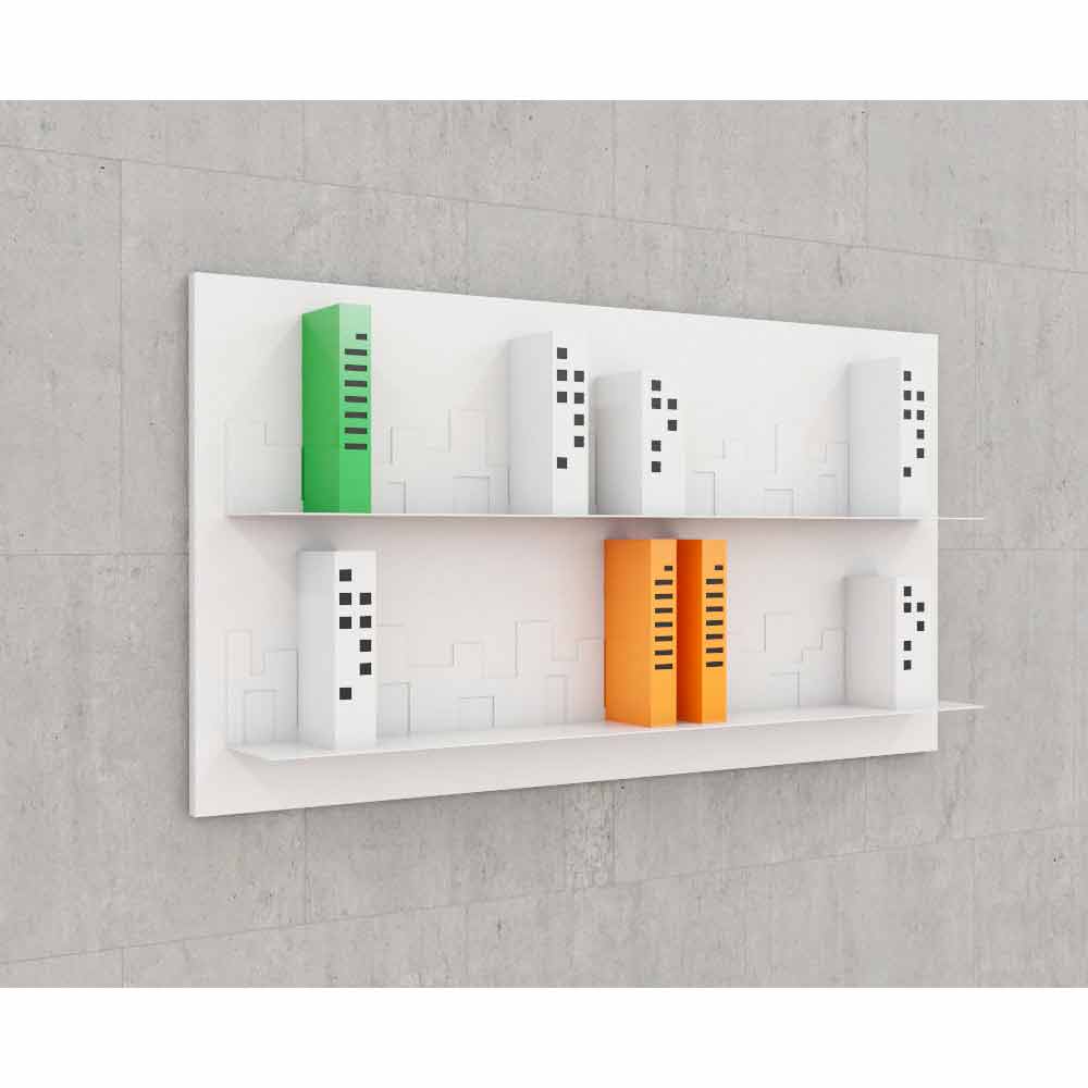 Como uma pintura pendurada na parede, o Skyline reproduz a aparência de uma metrópole moderna. Seus arranha-céus dividem os três níveis e podem ser usados como suportes de livros. Uma ideia original e funcional para decorar a sua casa e o seu escritório.