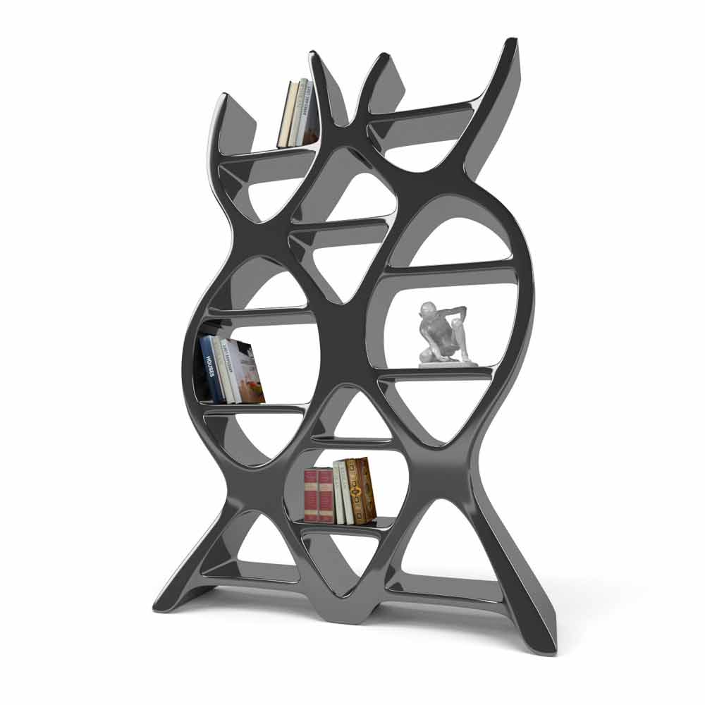 Além da estante, uma escultura inspirada no DNA, fonte de vida e conhecimento. As linhas suaves e sinuosas, aliadas a um forte impacto cénico, tornam a estante DNA adequada como um móvel exclusivo dentro da casa. Suas formas fora do comum também o tornam ideal para ambientes dedicados a bares literários ou bibliotecas de café. Estrutura de superfície sólida, disponível em diferentes cores: preto (RAL9005), vermelho rubi (RAL3003) ou branco pérola (RAL1013).