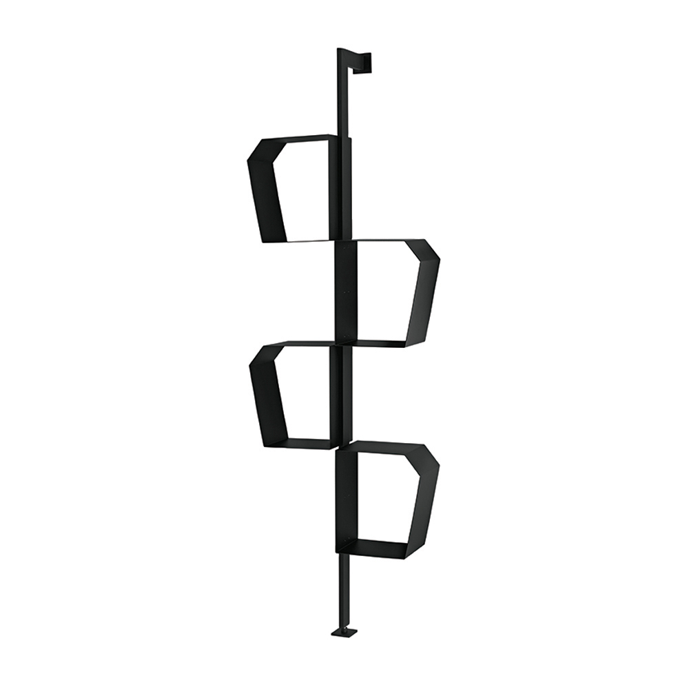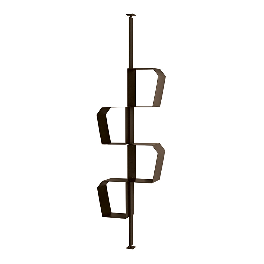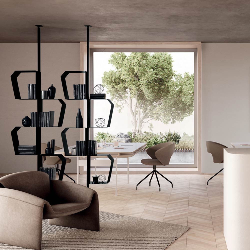 Graças à sua configuração versátil, a estante pode ser instalada com fixações na parede ou no teto . Na versão de teto, também pode ser usada como elemento divisório , perfeita para separar espaços, mantendo a leveza visual.