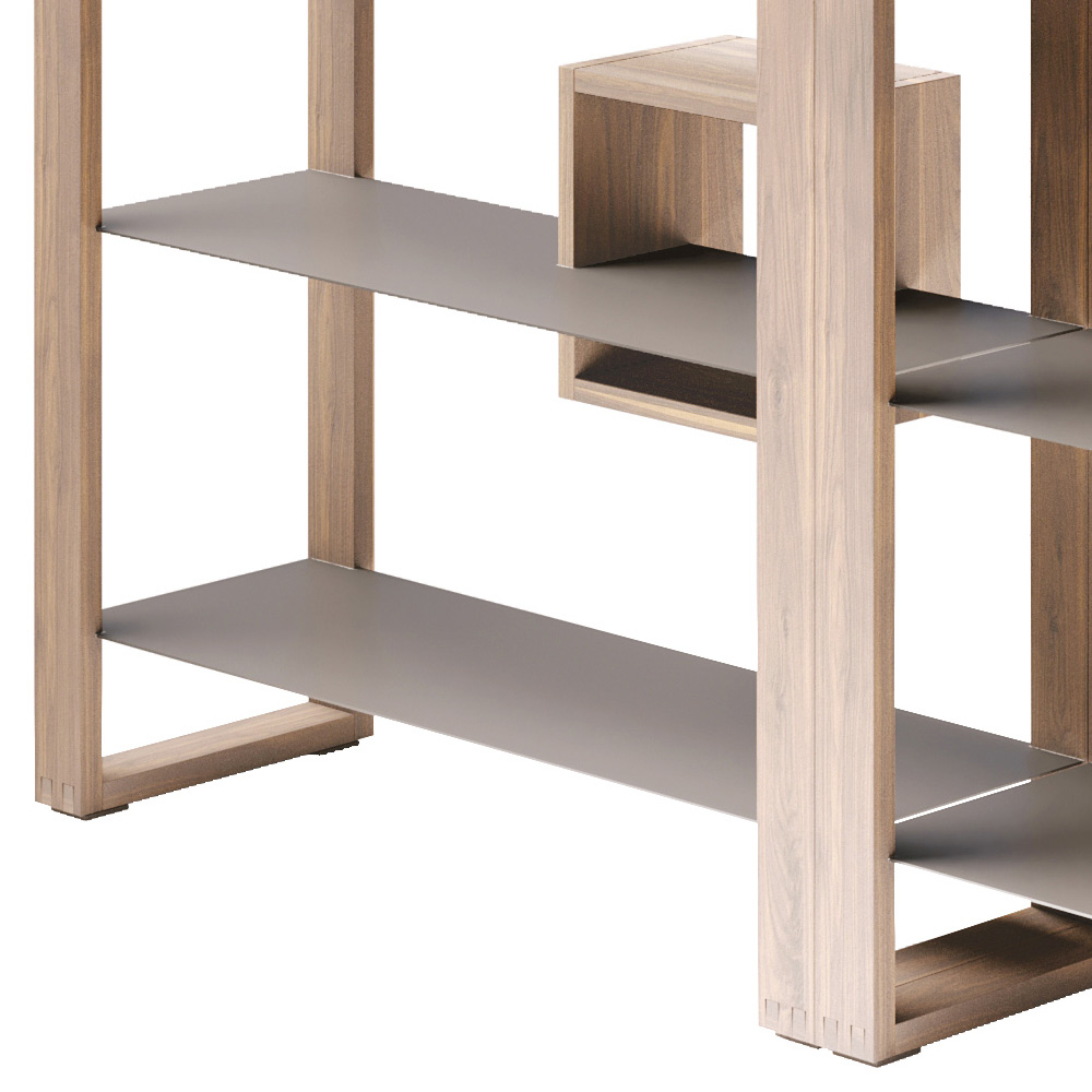 Estante aberta modular e intercambiável em madeira de nogueira com prateleiras em madeira lacada Made in Italy.