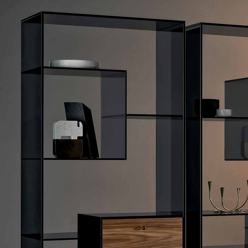 Esta estante expositora é caracterizada por seu design determinado e elegante inteiramente feito de vidro fumê.