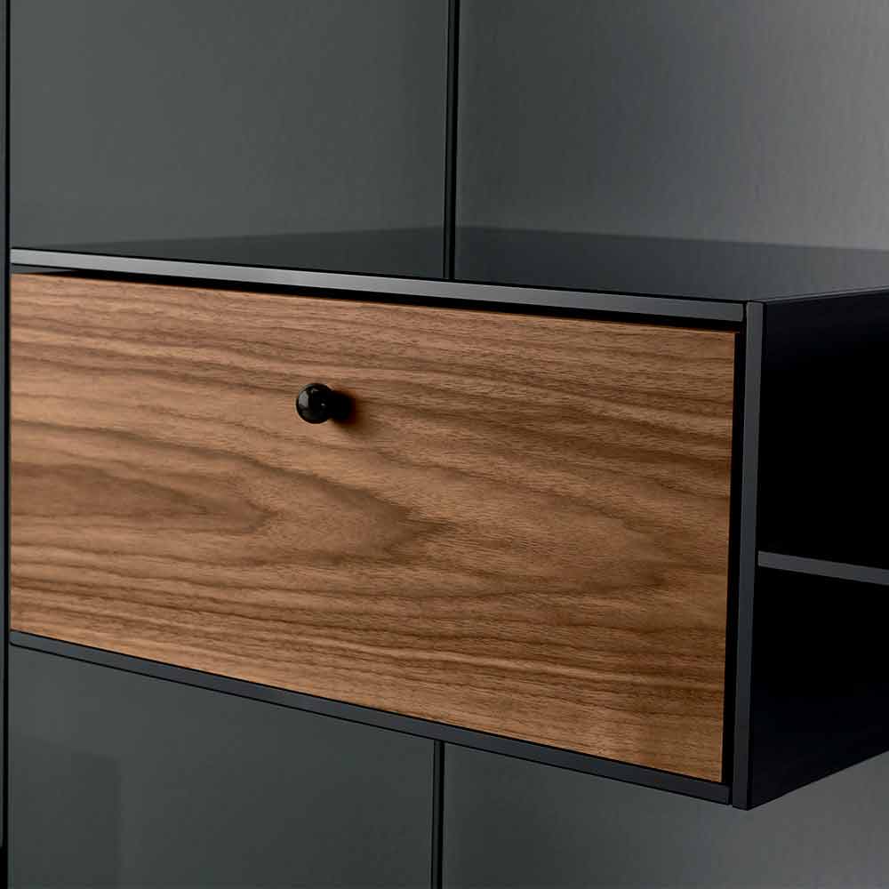 Inclui uma gaveta em madeira de nogueira canaletto com puxador com acabamento em bronze que pode ser posicionada conforme desejado nos dois compartimentos de referência. A carga permitida para cada prateleira é de 15 kg.