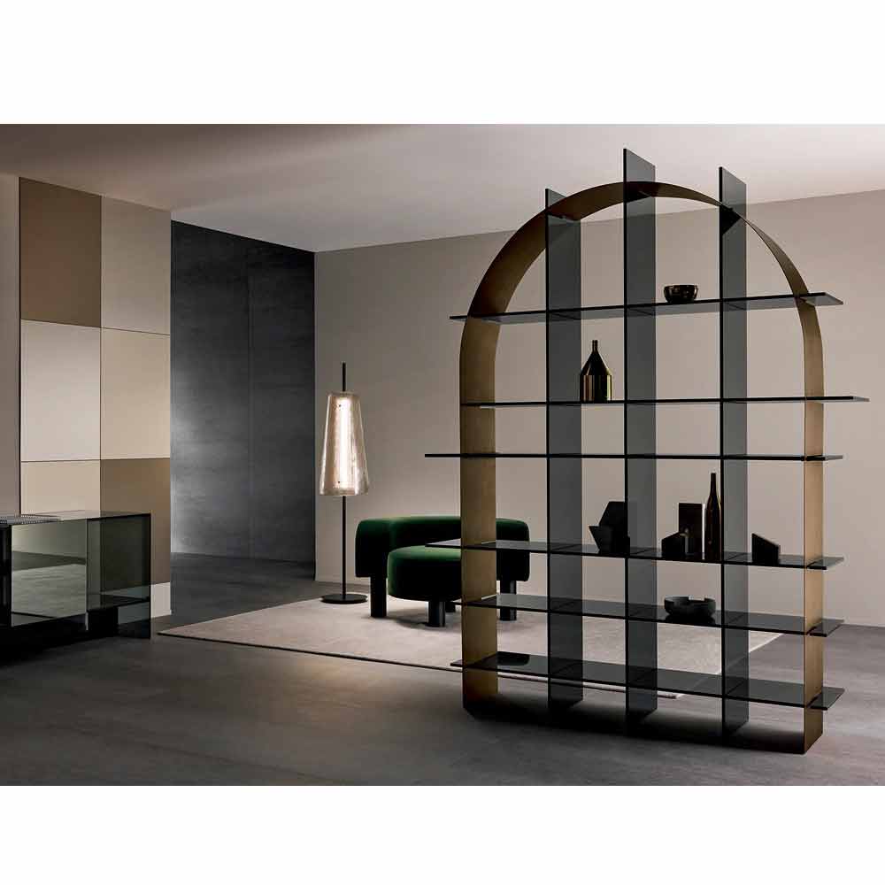 Esta estante para sala de estar caracteriza-se pelo seu design único e incrivelmente elegante, composto por laterais e prateleiras inteiramente em vidro fumê.