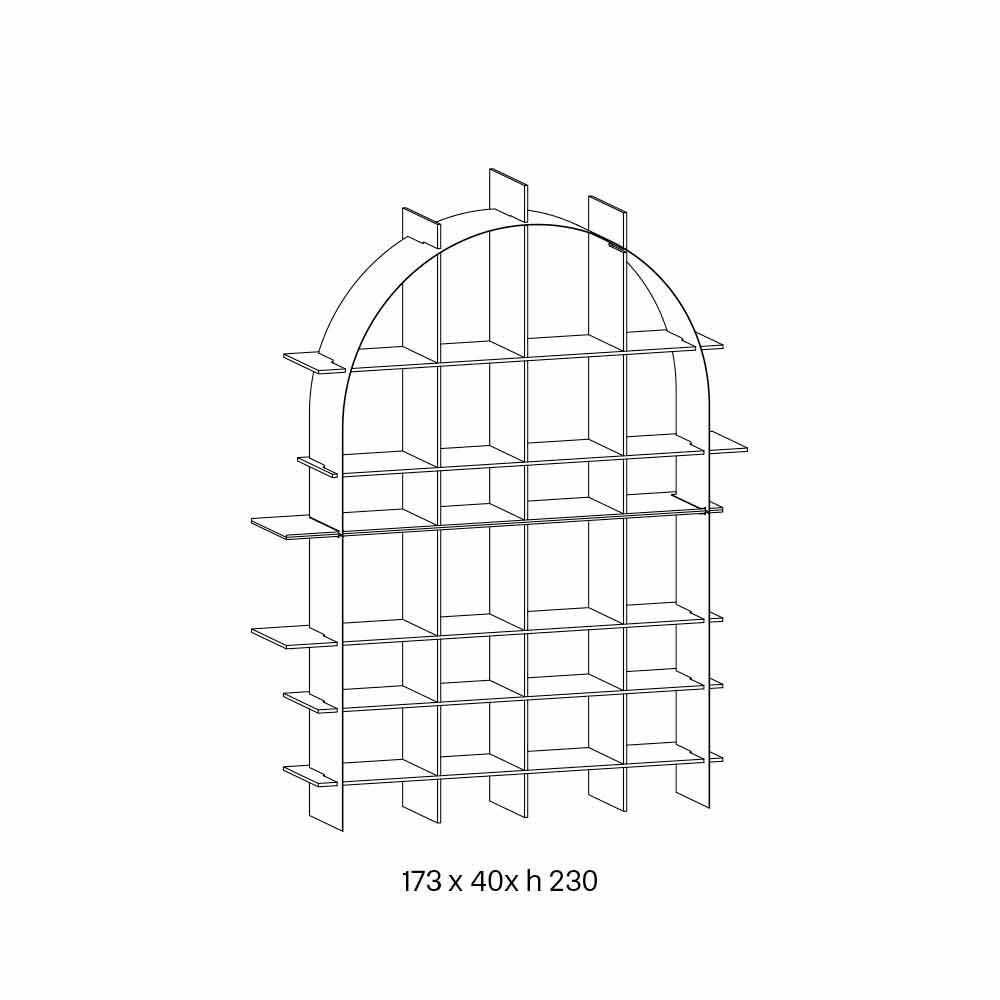 A sua peculiaridade consiste na estrutura entrelaçada em chapa fina em forma de arco com acabamento em bronze escovado que se integra na composição conferindo um efeito de extremo requinte e geometria.