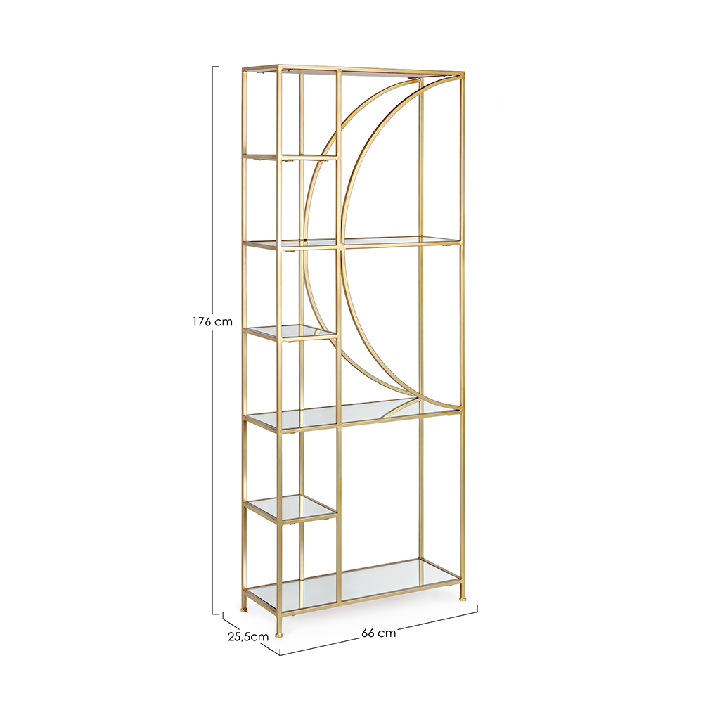 Estante independente de aço e estantes de vidro de design elegante.